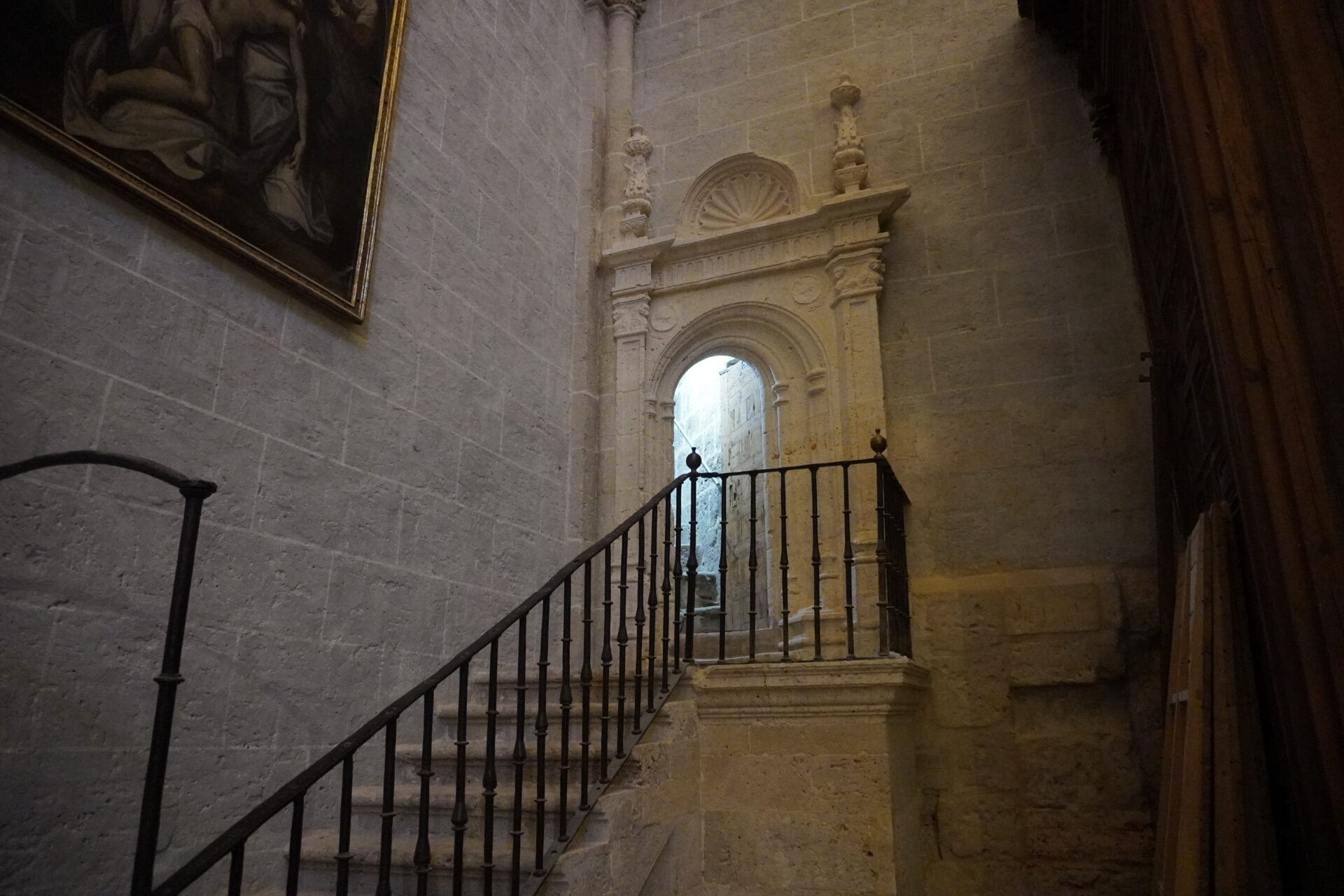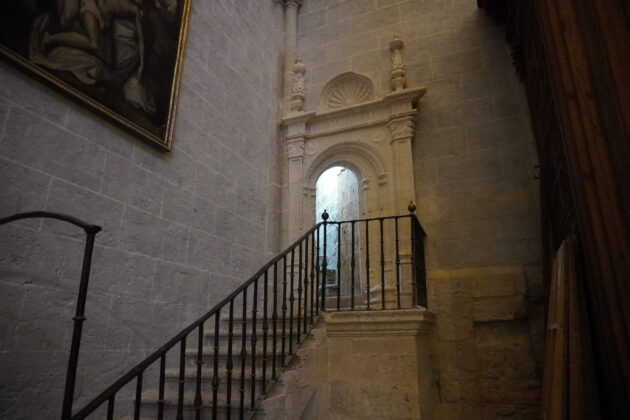 El recorrido se ha iniciado con el ascenso hasta la girola, y sus cubiertas. Una subida a través de una escalera de caracol y cuyas paredes albergan piedras de sillería de los restos de la catedral románica.