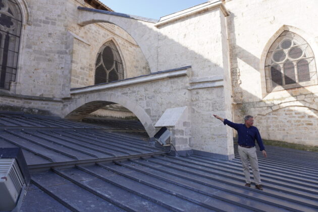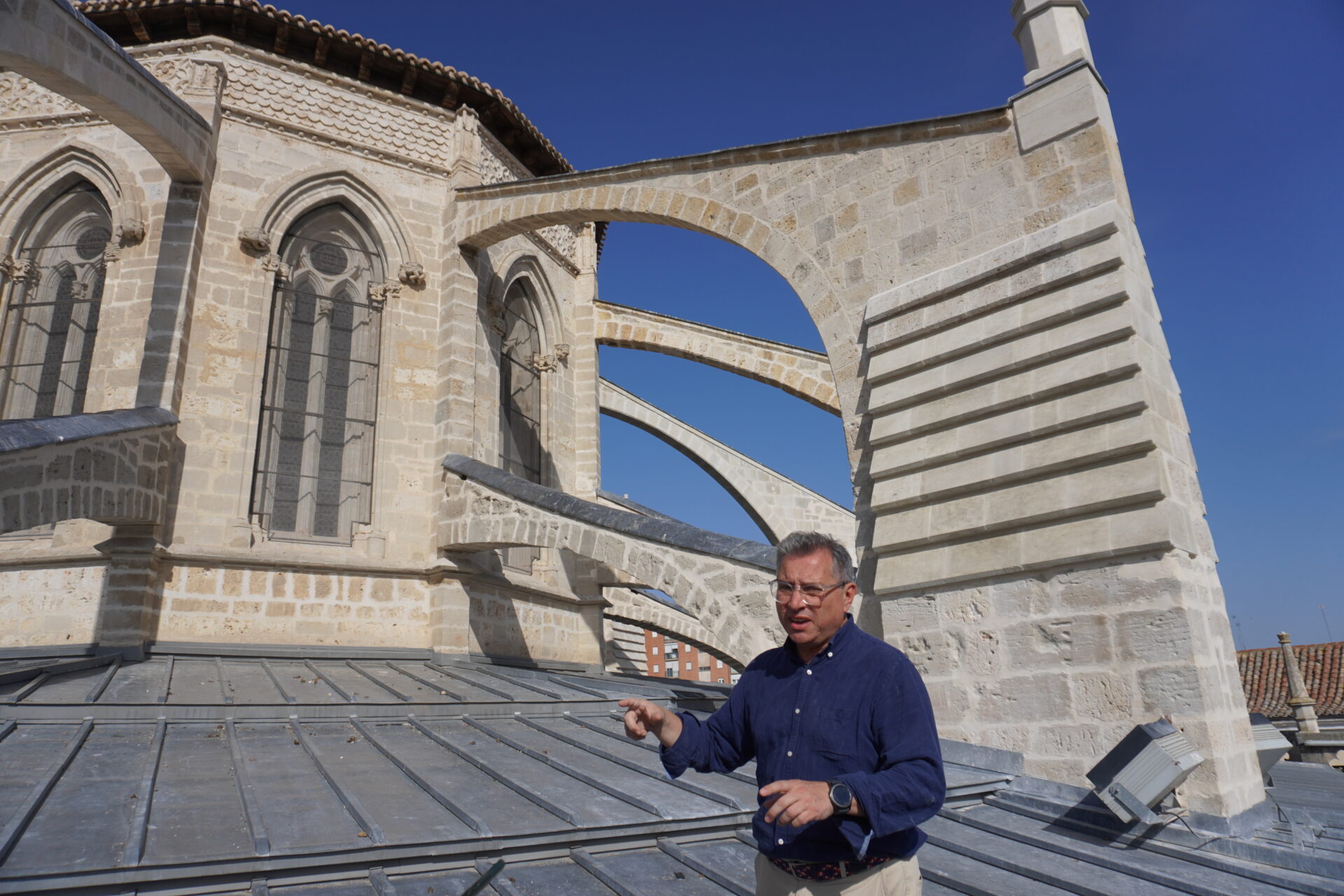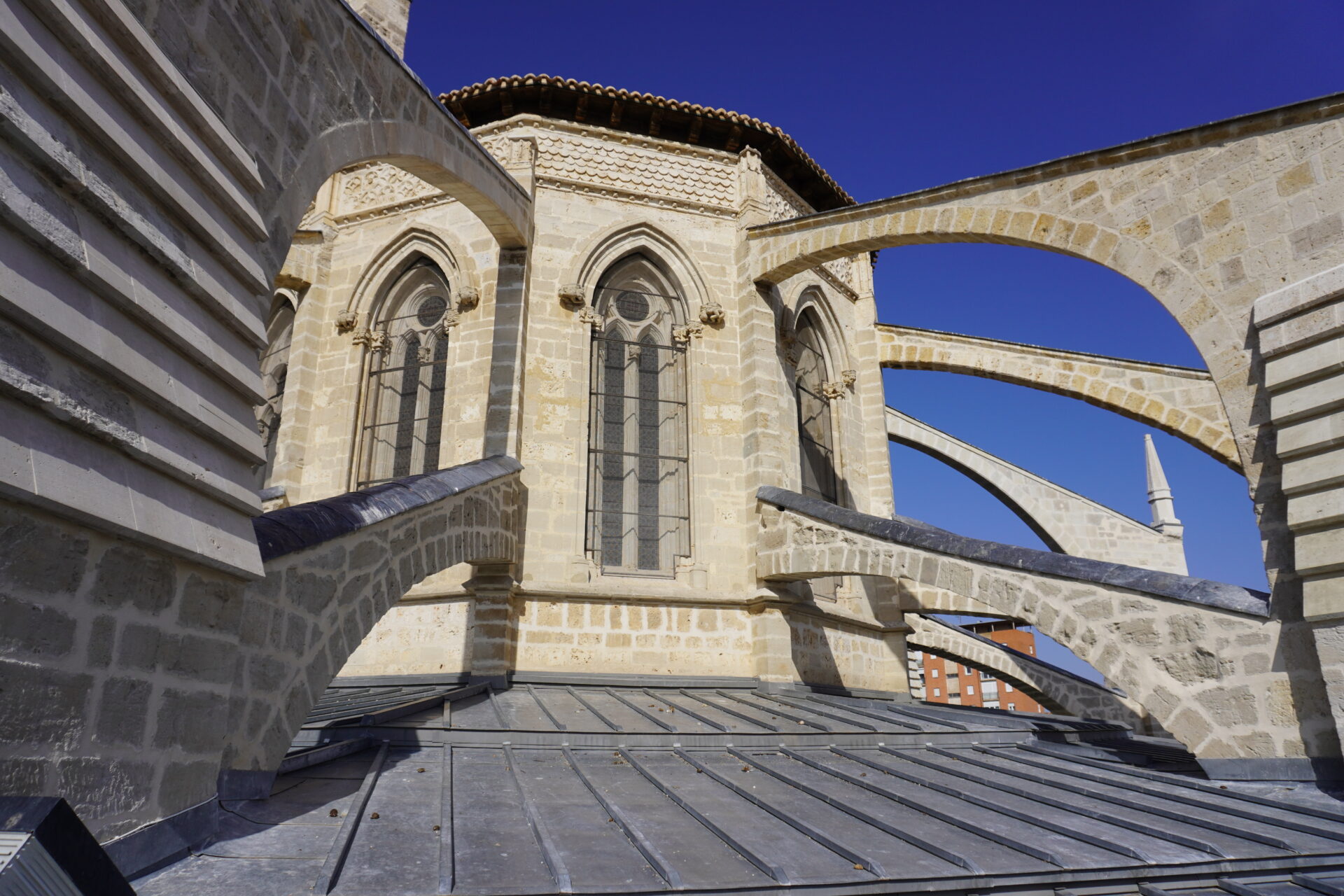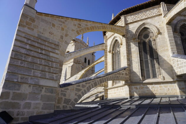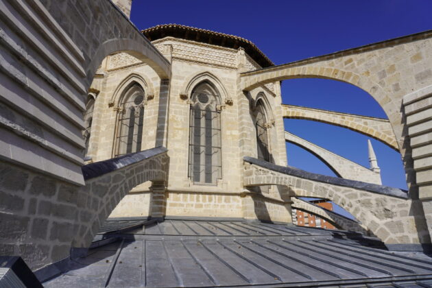 Los trabajos realizados en la cubierta, concretamente en la cabecera del templo, han consistido en la reparación de los arbotantes que estaban muy deteriorados, así como de los pináculos. Se ha hecho una labor de reposición de todos esos elementos así como de restauración de toda la cantería. En el caso de los arbotantes, en algunos puntos, ha habido que hacer operaciones de consolidación estructural y de protección con láminas de plomo. “Estos lomos de plomo evitan la infiltración de humedad por la parte superior que era lo que originada que todos los arbotantes estuvieran colonizados de líquenes”, explicaron los arquitectos Florentino Díez y Nacho Vela. Todos estos trabajos han conseguido restituir una imagen más noble de la Catedral desde el exterior, y que puede observarse desde la Plaza de la Inmaculada, la Calle Doña Urraca y desde la Calle del Hospital.