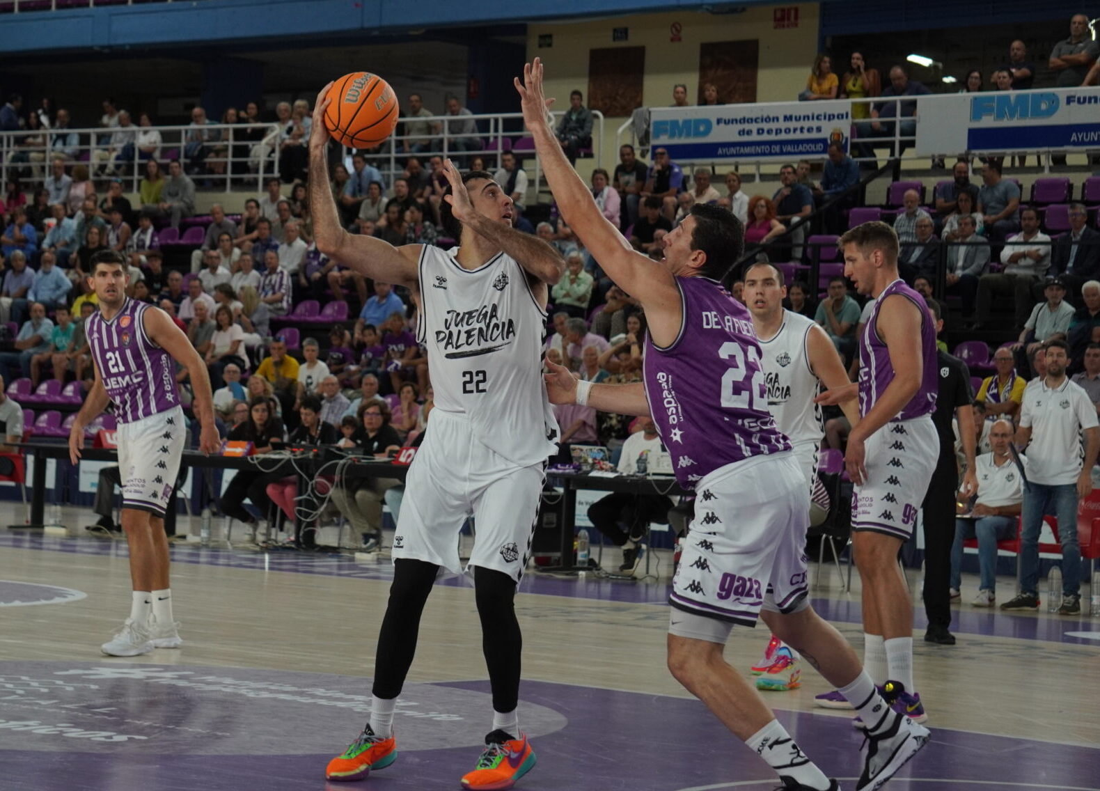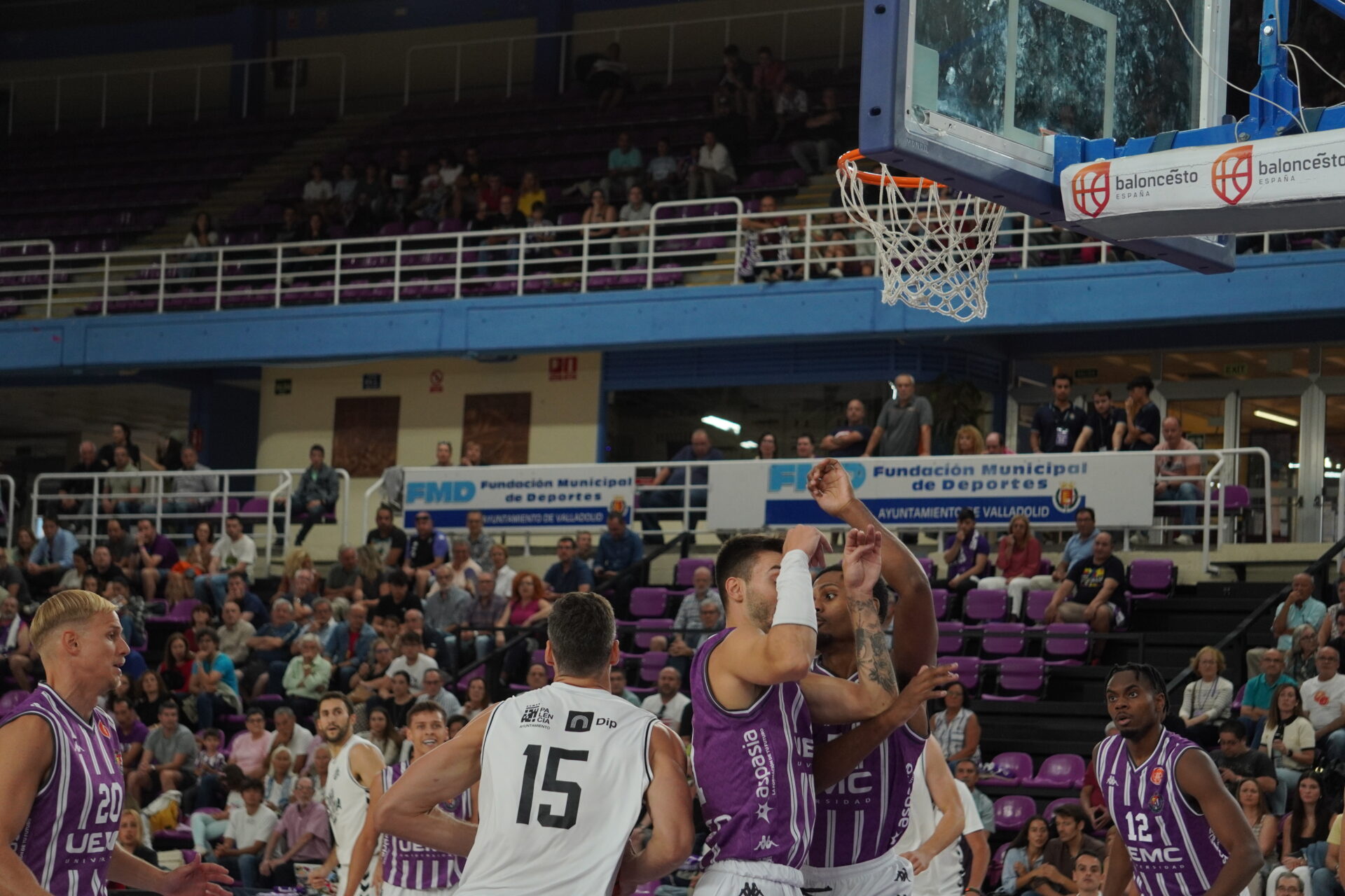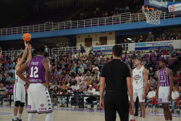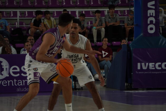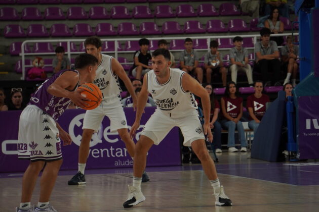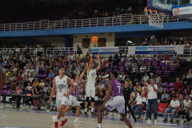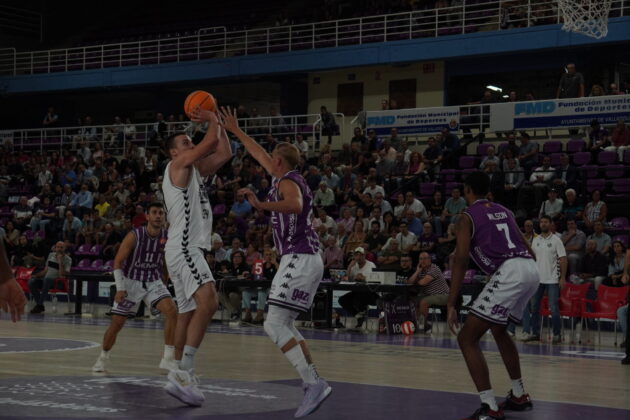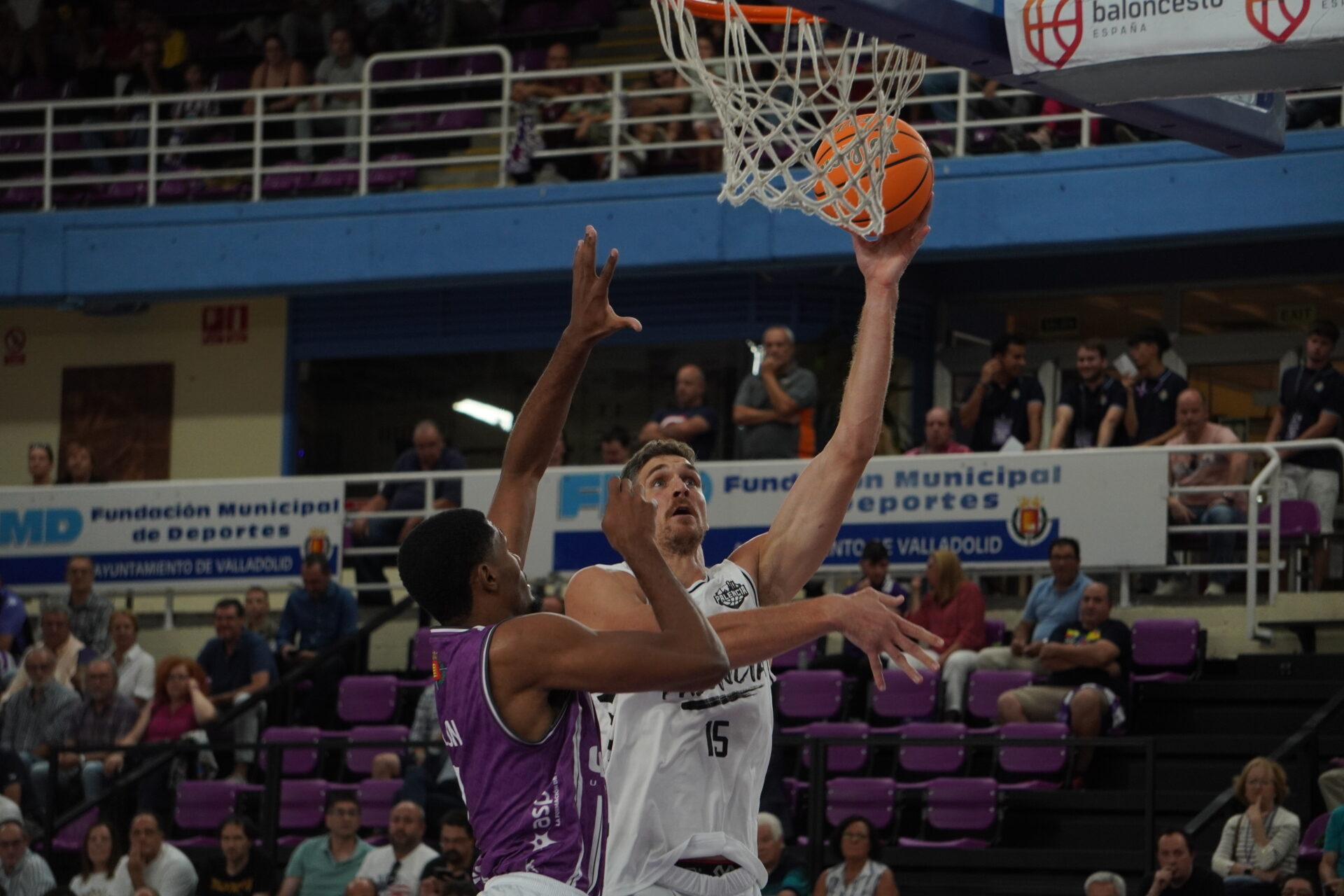 El segundo cuarto comenzó con el Valladolid metiendo presión con un triple no demasiado defendido por Dimitrov, que sí lo había hecho bien antes contra con Kovacevic. Un triple contestado con dos canastas seguidas del Palencia. Una de Mballa, tras recibir un taponazo (coraje no le falta) y otra, por la puerta de atrás, de Vaulet, hasta ese momento el más destacad o de los morados, hoy de blanco.