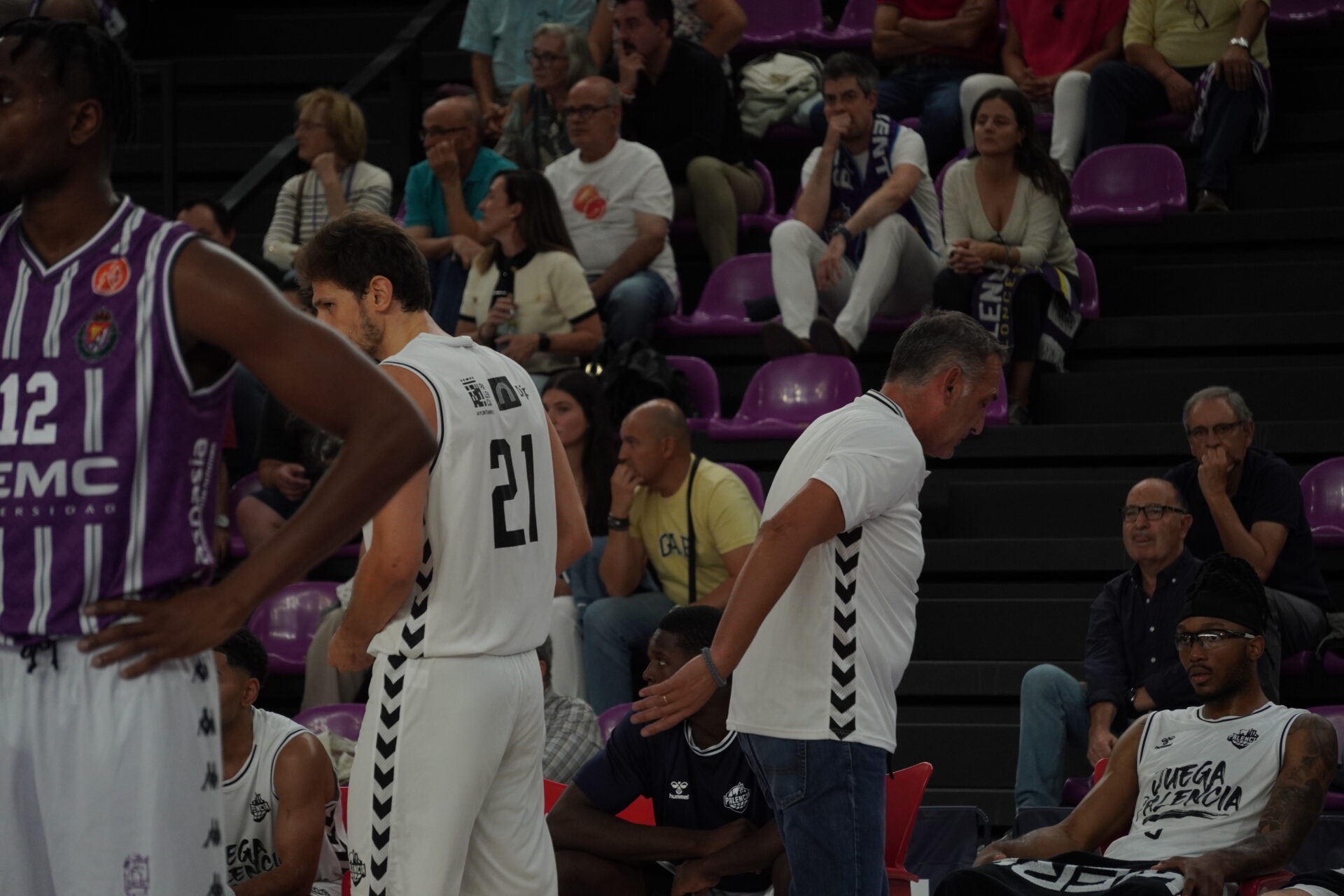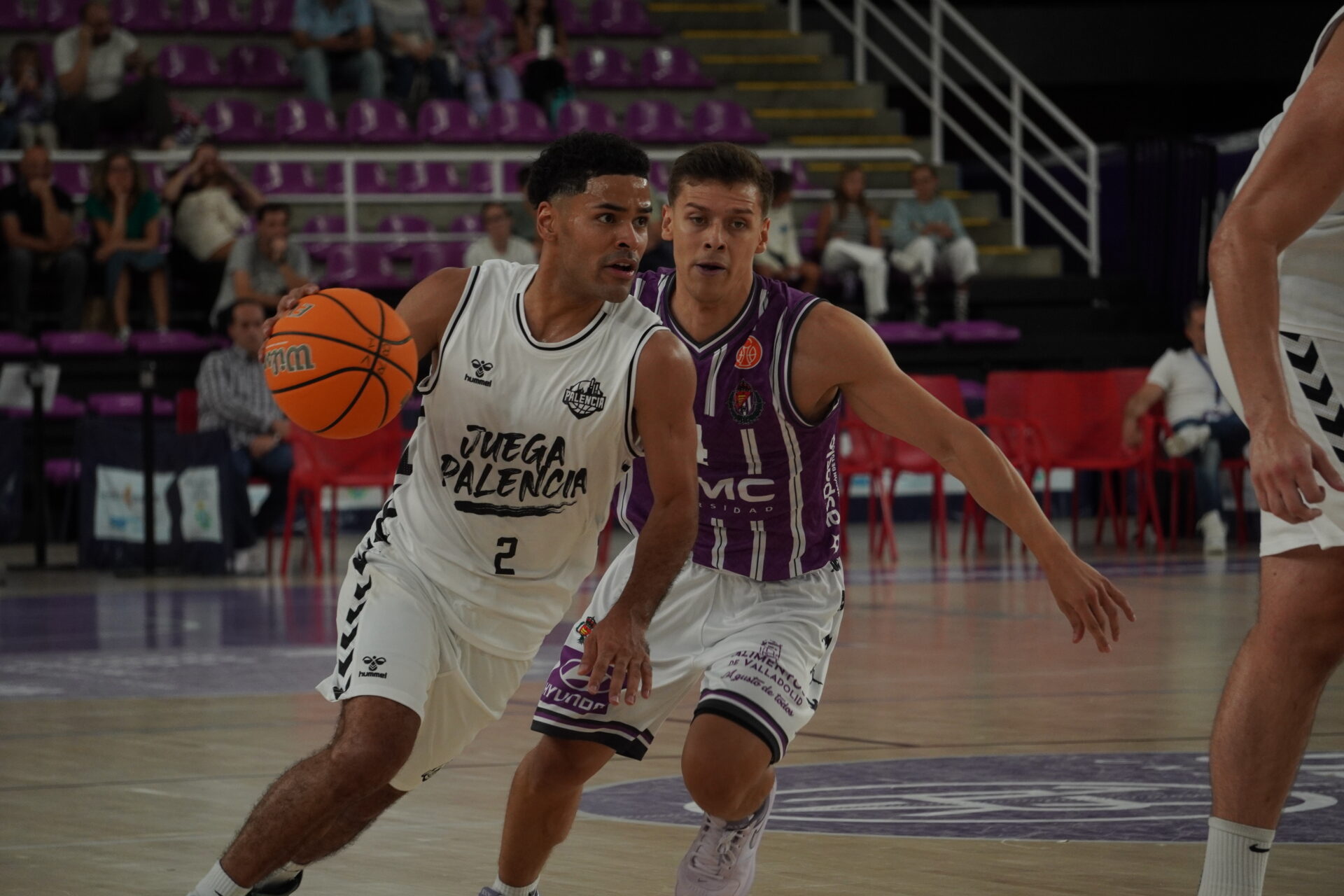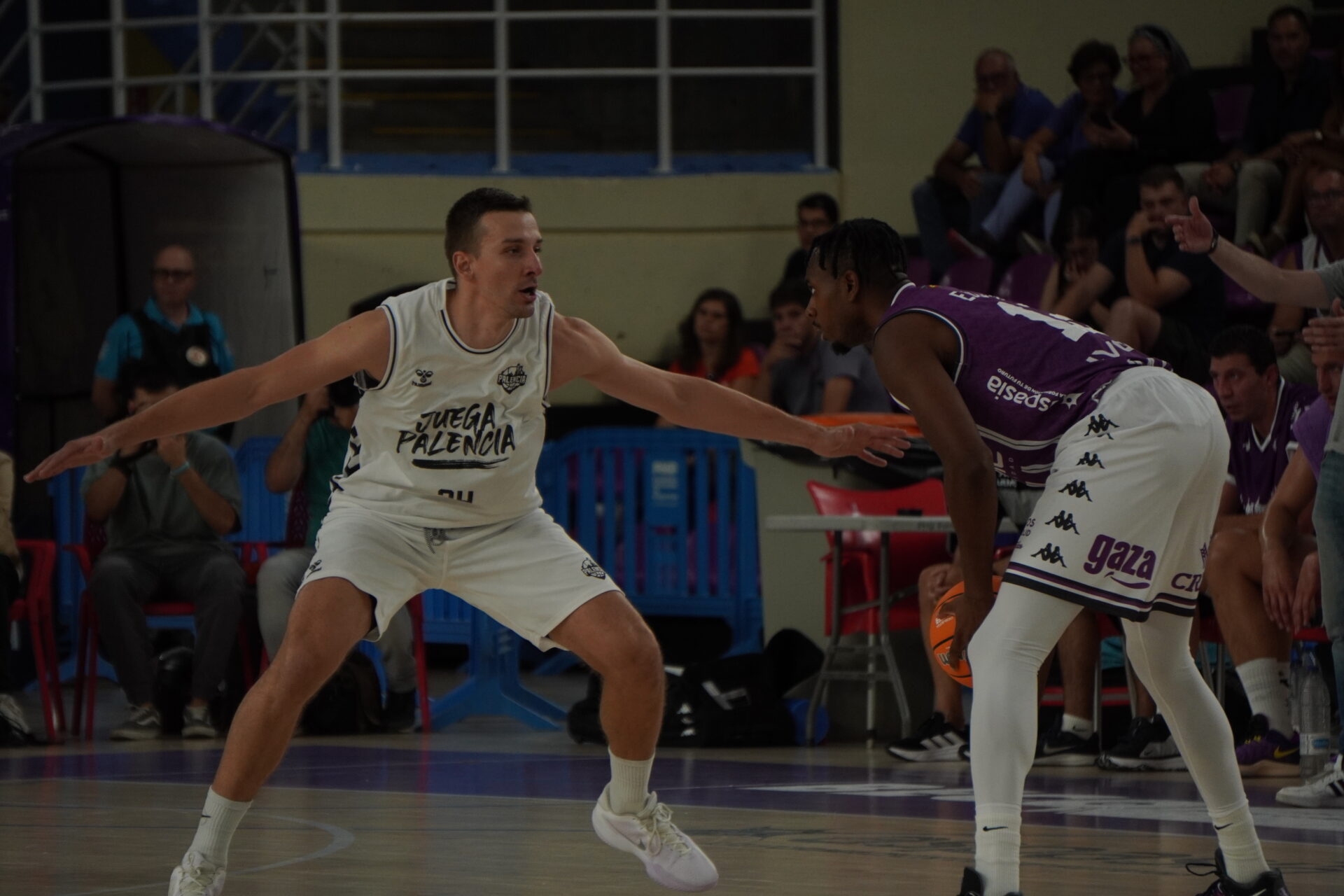 El segundo cuarto comenzó con el Valladolid metiendo presión con un triple no demasiado defendido por Dimitrov, que sí lo había hecho bien antes contra con Kovacevic. Un triple contestado con dos canastas seguidas del Palencia. Una de Mballa, tras recibir un taponazo (coraje no le falta) y otra, por la puerta de atrás, de Vaulet, hasta ese momento el más destacad o de los morados, hoy de blanco.