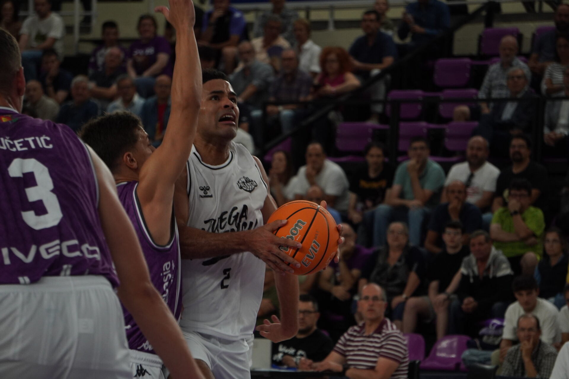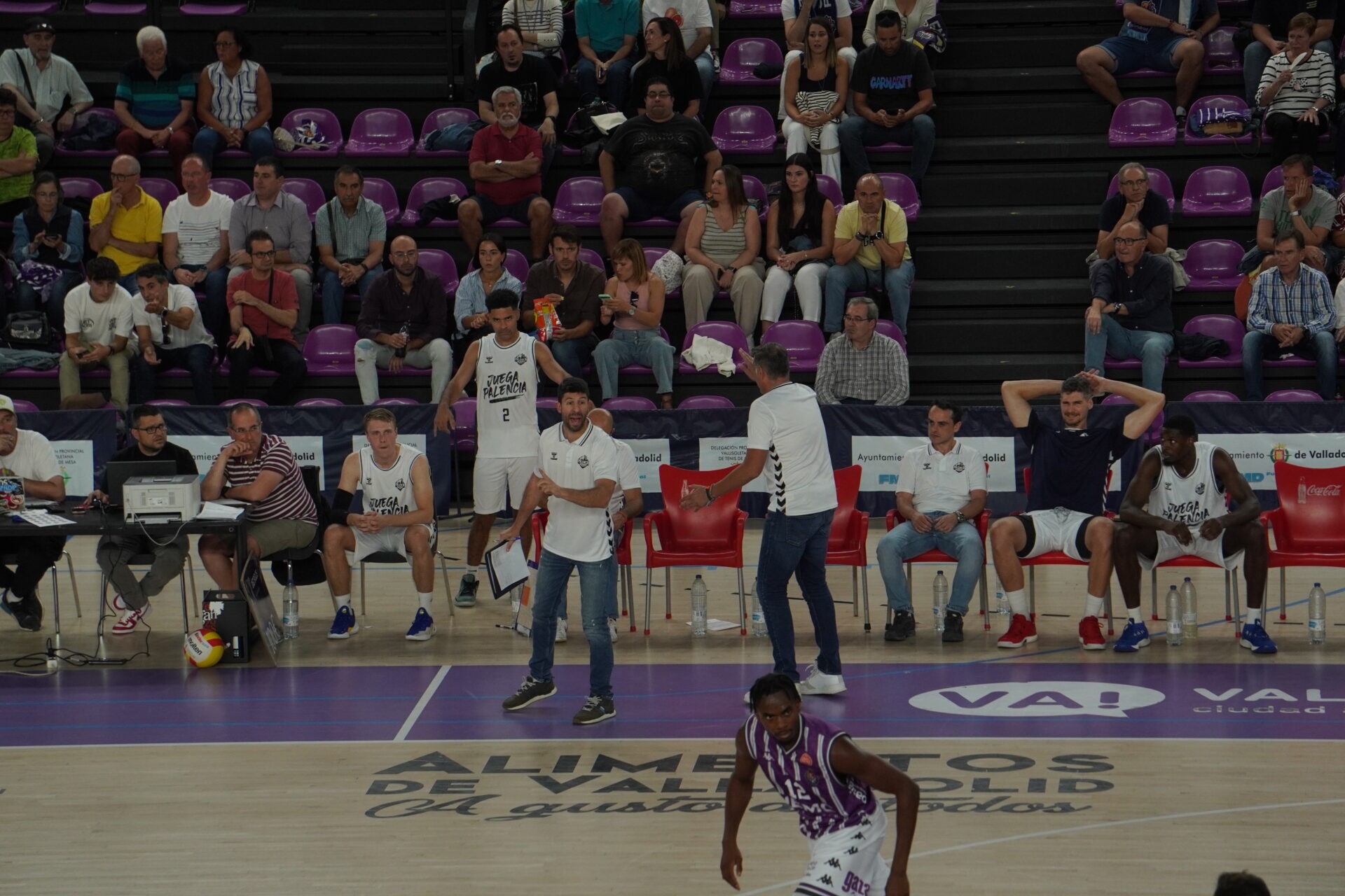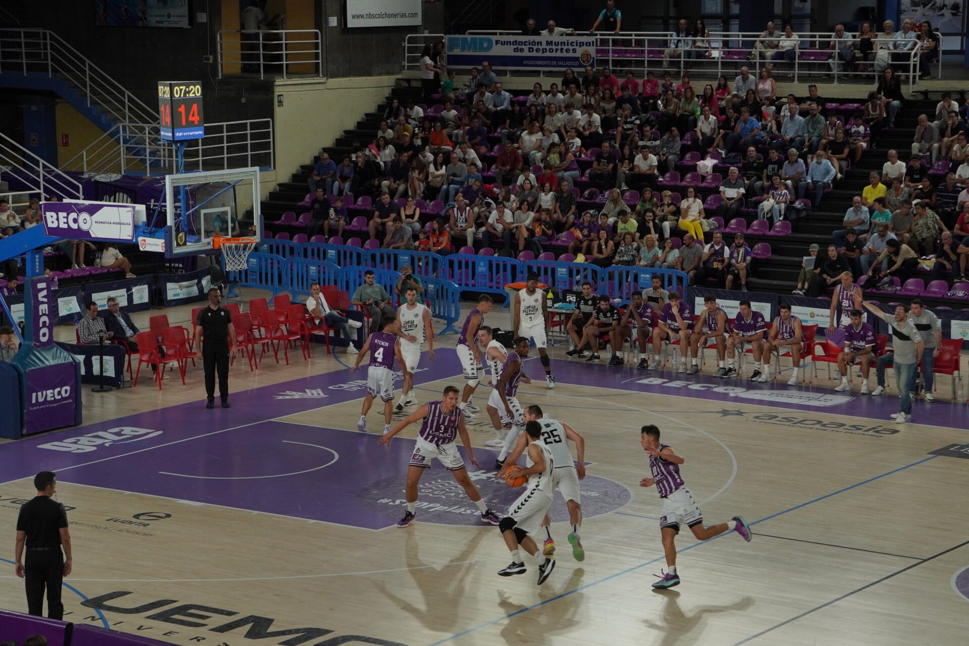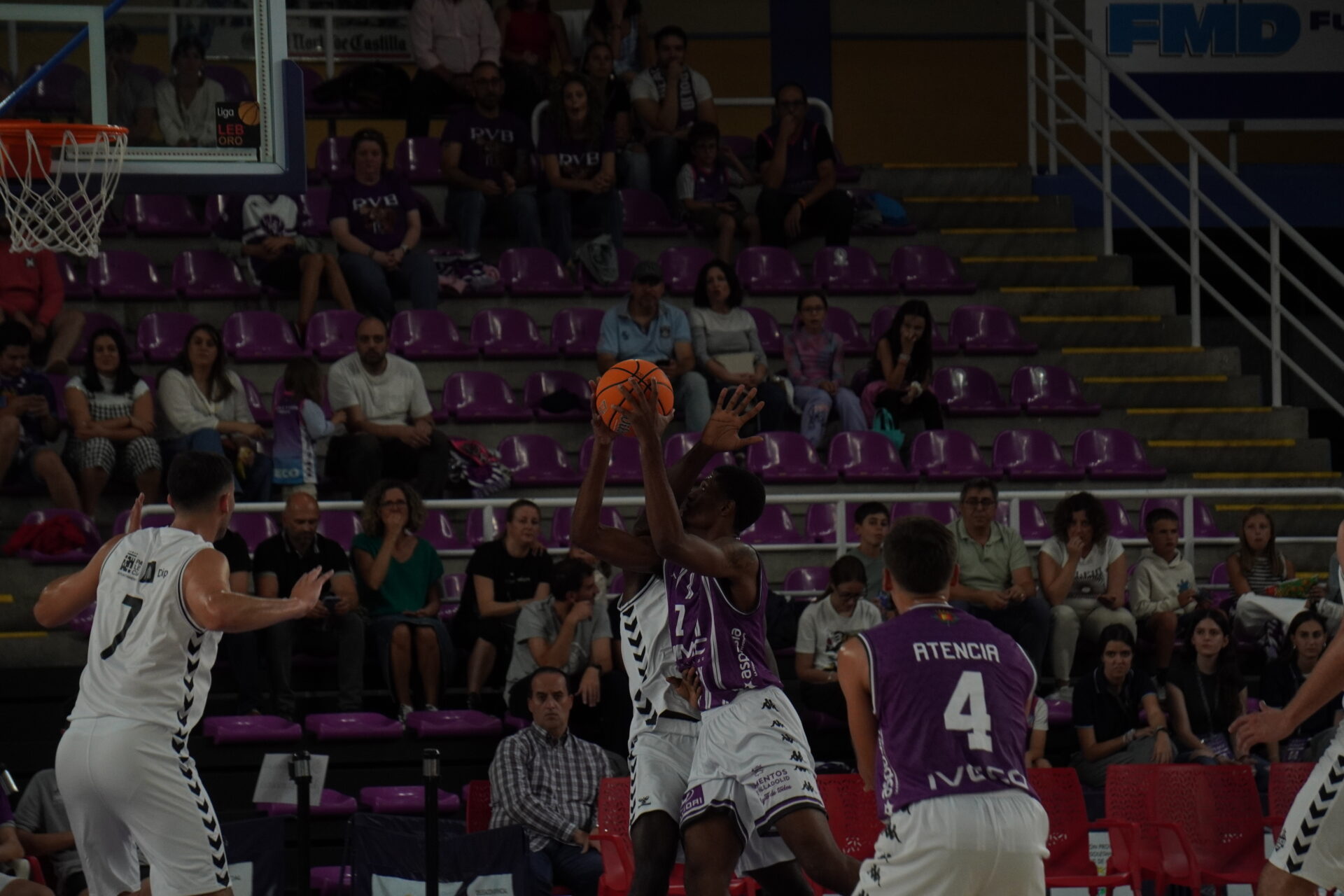 El segundo cuarto comenzó con el Valladolid metiendo presión con un triple no demasiado defendido por Dimitrov, que sí lo había hecho bien antes contra con Kovacevic. Un triple contestado con dos canastas seguidas del Palencia. Una de Mballa, tras recibir un taponazo (coraje no le falta) y otra, por la puerta de atrás, de Vaulet, hasta ese momento el más destacad o de los morados, hoy de blanco.