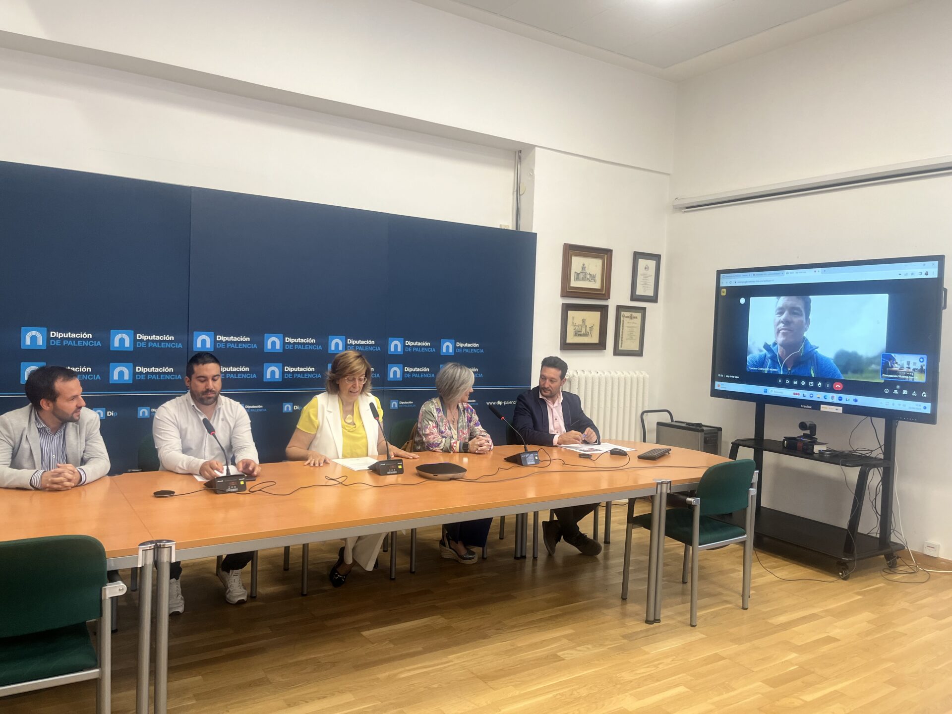 La presidenta de la Diputación de Palencia, Ángeles Armisén (en e centro), acompañada, a su derecha, por el diputado el diputado del área de Desarrollo Socioeconómico, Turismo y Deportes, Francisco Pérez, el diputado del servicio de Deportes, Eduardo Tejido, el asesor del panel de Trail de la Real Federación Española de Atletismo (RFEA), Francisco Caballero (en la pantalla), y los alcaldes de Aguilar, María José Ortega, y de Barruelo de Santullán, Cristian Delgado