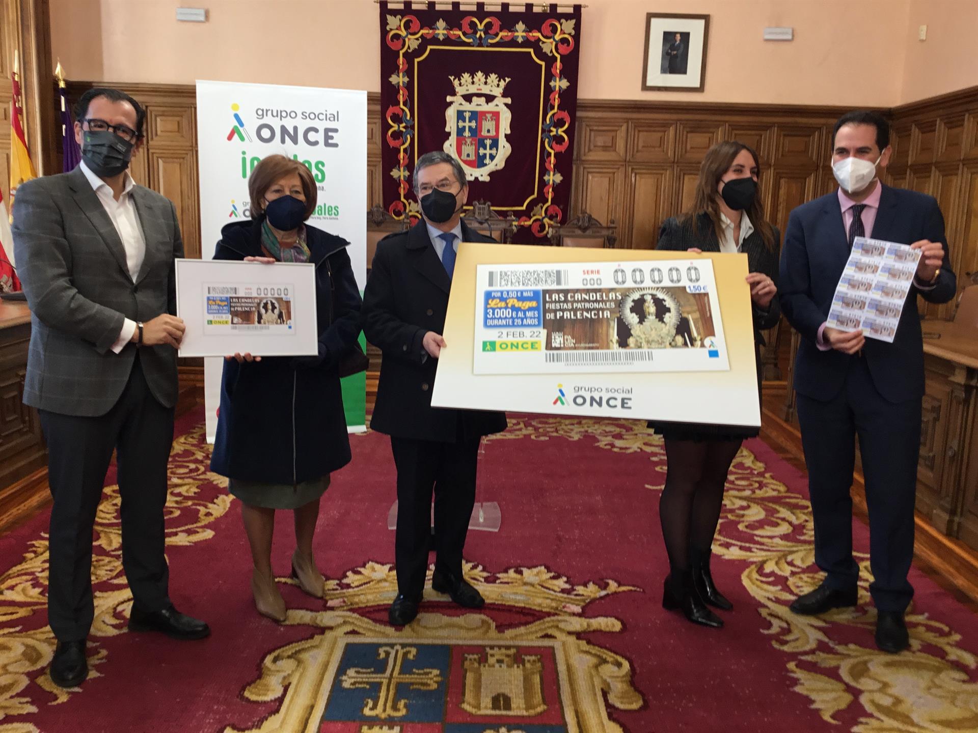 El alcalde de Palencia, Mario Simón, y el delegado territorial de la ONCE en Castilla y León, Ismael Pérez, han presentado este jueves el cupón en un acto que ha tenido lugar en el Ayuntamiento de la ciudad, y en el que han estado acompañados por la directora de ONCE en Palencia, Paula Calvete; el presidente de la Cofradía Nuestra Señora de la Calle, Carmelo García, y otros miembros de la mencionada Cofradía, encargada de custodiar la Virgen de la Calle y patrona de la capital palentina.
