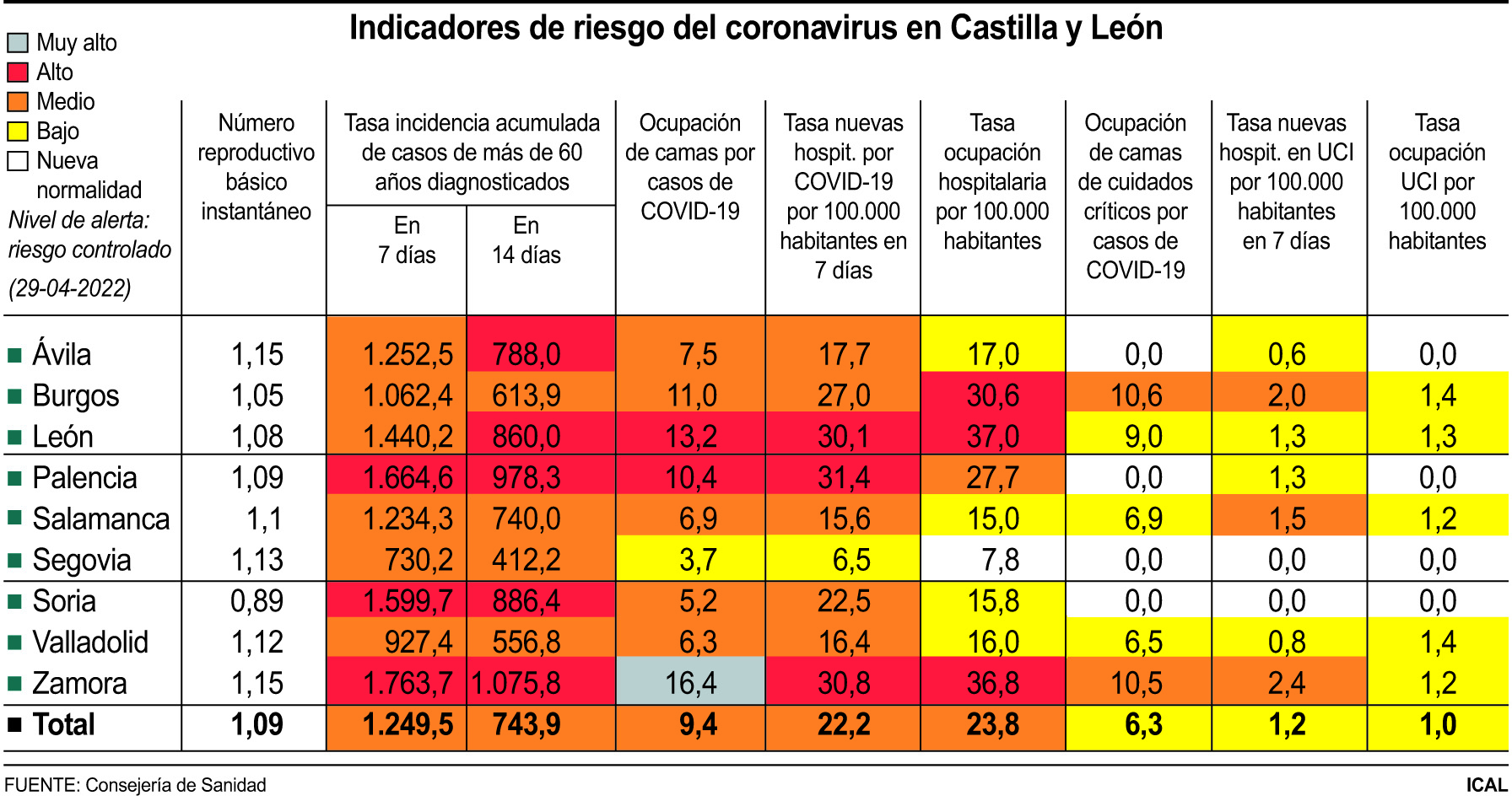 En cuanto a 14 días, también Zamora presenta la incidencia más alta con 1.763,74 casos, por delante de Palencia, con 1.664,57, y Soria, con 1.599,72. Le siguen en riesgo medio León, con 1.440,24; Ávila, con 1.252,49; Salamanca, con 1.234,27; Burgos, con 1.062,36; Valladolid, con 927,35, y Segovia, con 730,2.