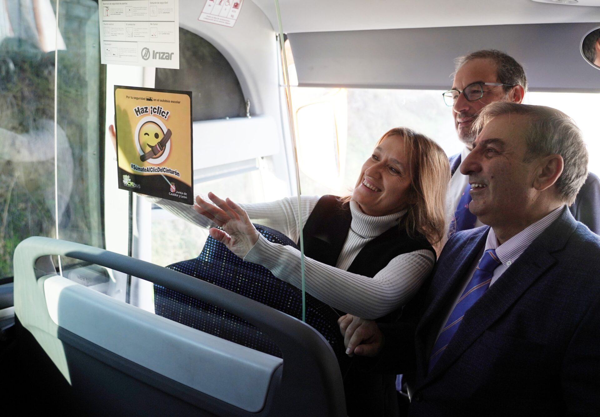 ICAL. La consejera de Educación, Rocío Lucas, y el consejero de Movilidad y Transformación Digital, José Luis Sanz, presentaron hoy en el colegio público de Los Zumacales, en Simancas (Valladolid), una campaña de concienciación sobre el uso del cinturón de seguridad en el transporte escolar a la que también se ha sumado la Federación Empresarial Castellano y Leonesa de Transporte de Autobús (Fecylbus).
