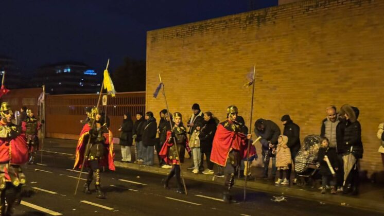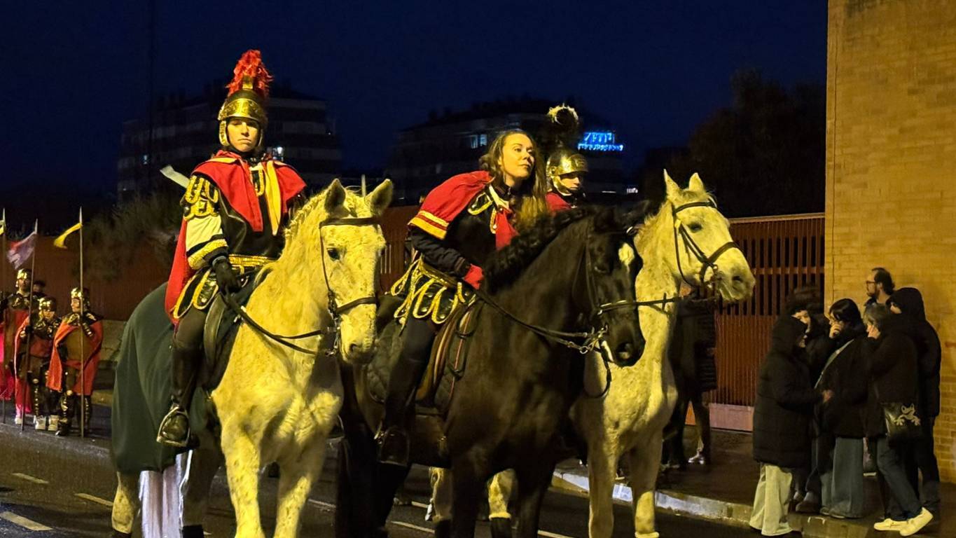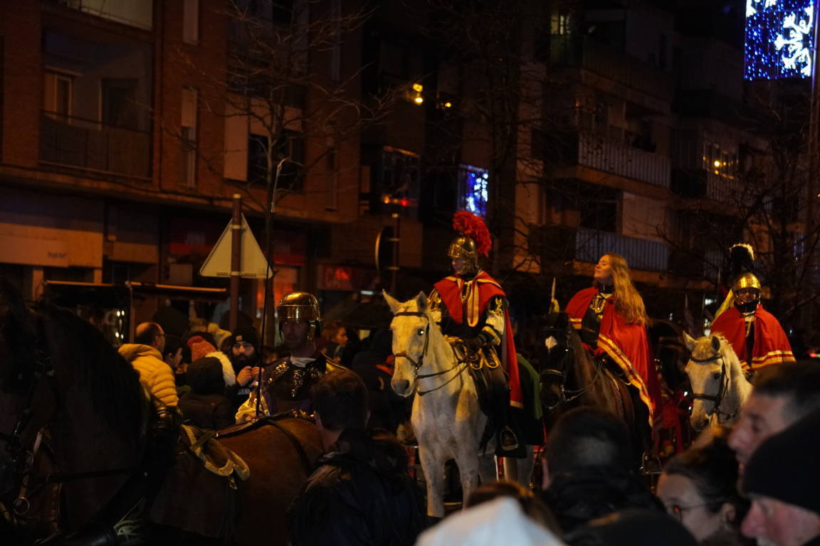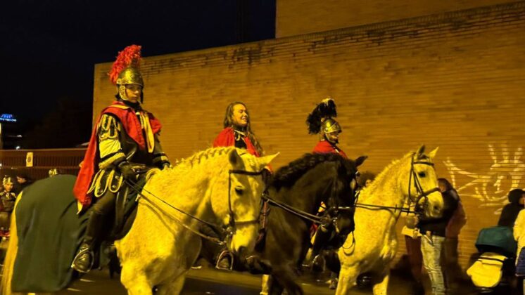 Los romanos, a caballo y a pie, un año más sirvieron de escolta a sus Majestades, anunciados por tambores y por un carro de Campanas.