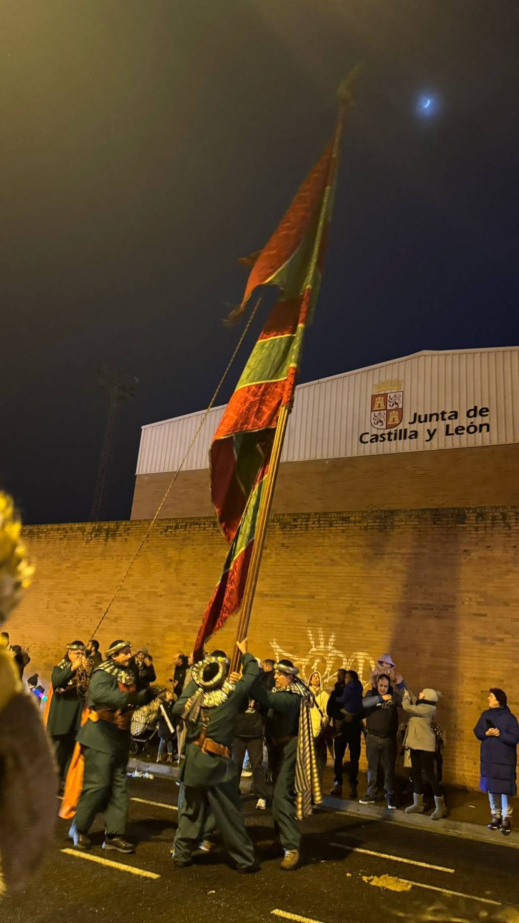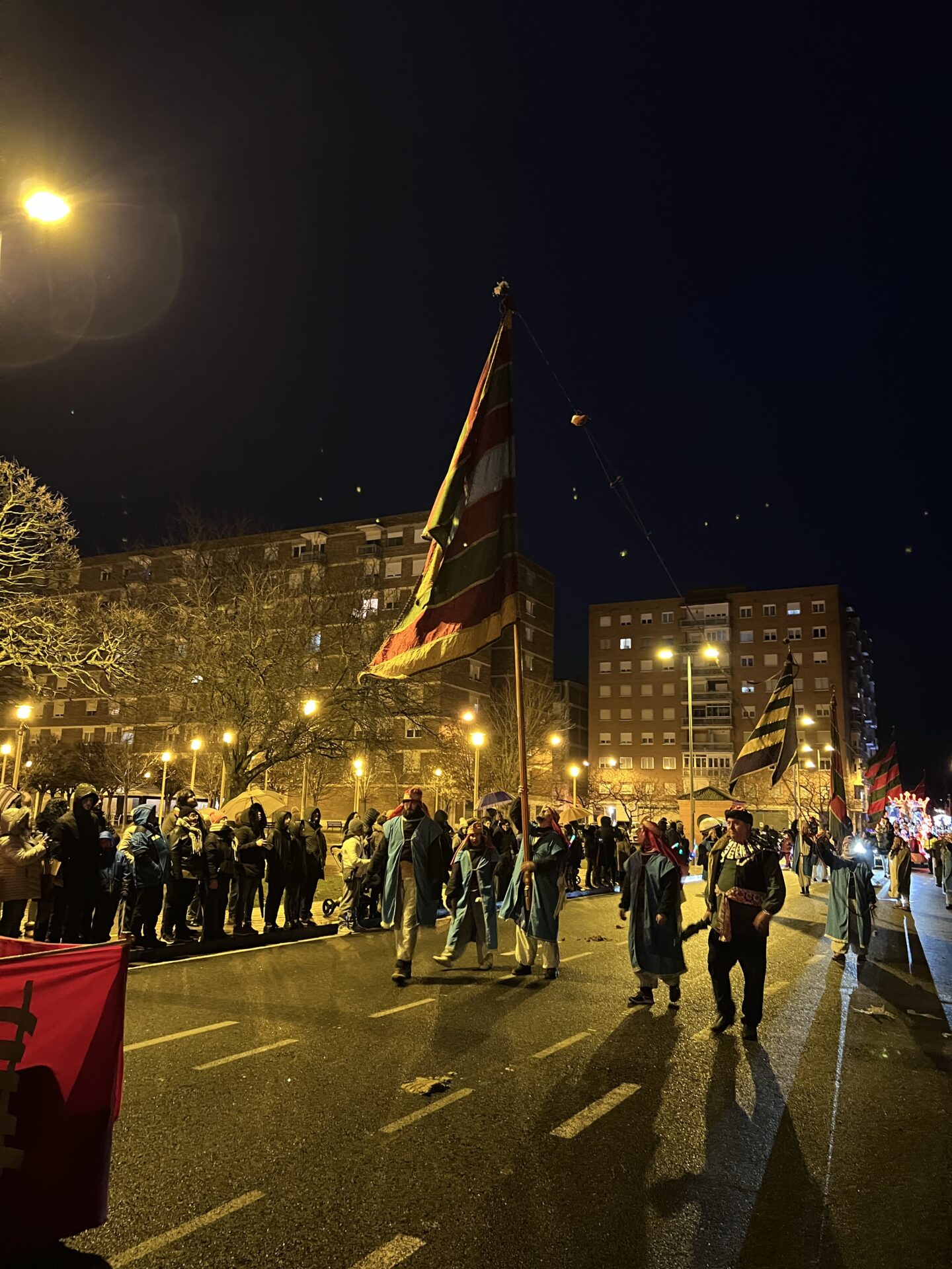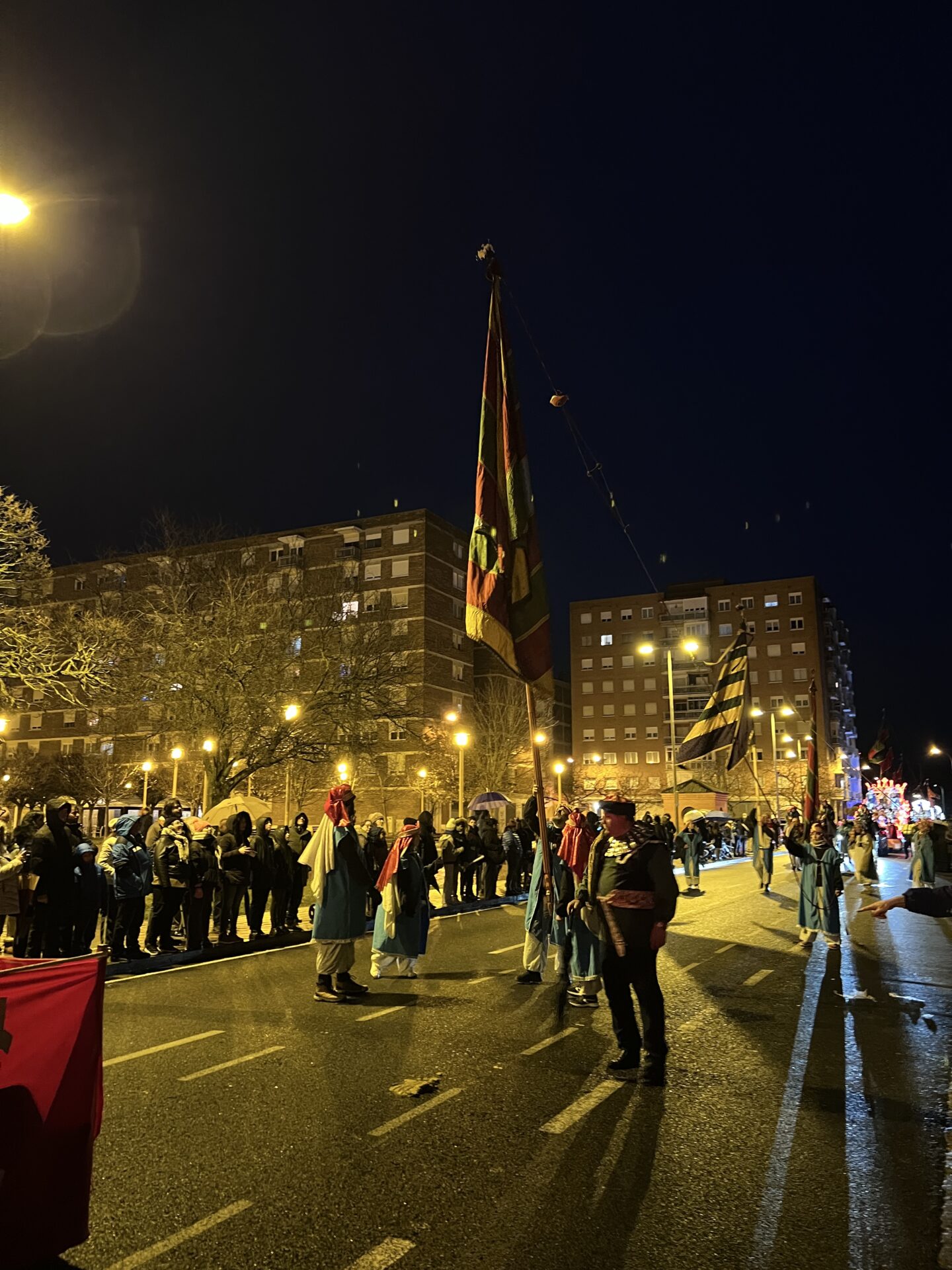 Y tras ellos, los verdaderos protagonistas de toda la tarde: los Reyes Magos. Melchor, Gaspar y Baltasar acompañados de sus pajes, precedidos de varios pendones de Palencia.