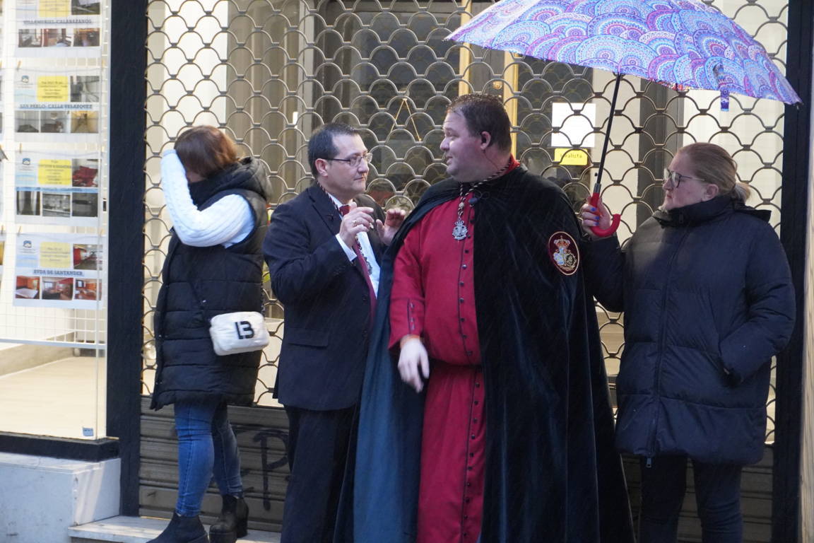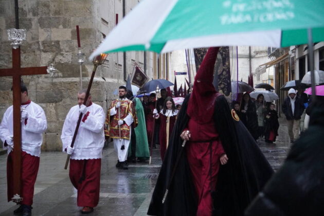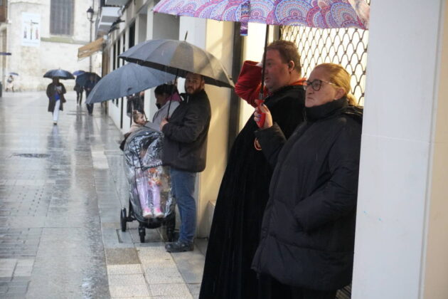 Tampoco se puede decir que hubiera dudas sobre qué decisión tomar, dado que la lluvia caía con fuerza minutos antes de que, a las 19,30 horas tuviera que tomar la salida el cortejo procesional desde la calle Árbol del Paraíso para, tras pasar por el centro de la ciudad, llegar a la lectura de La Sentencia junto al soportal del Casino a eso de las 22,15 horas (previsión).