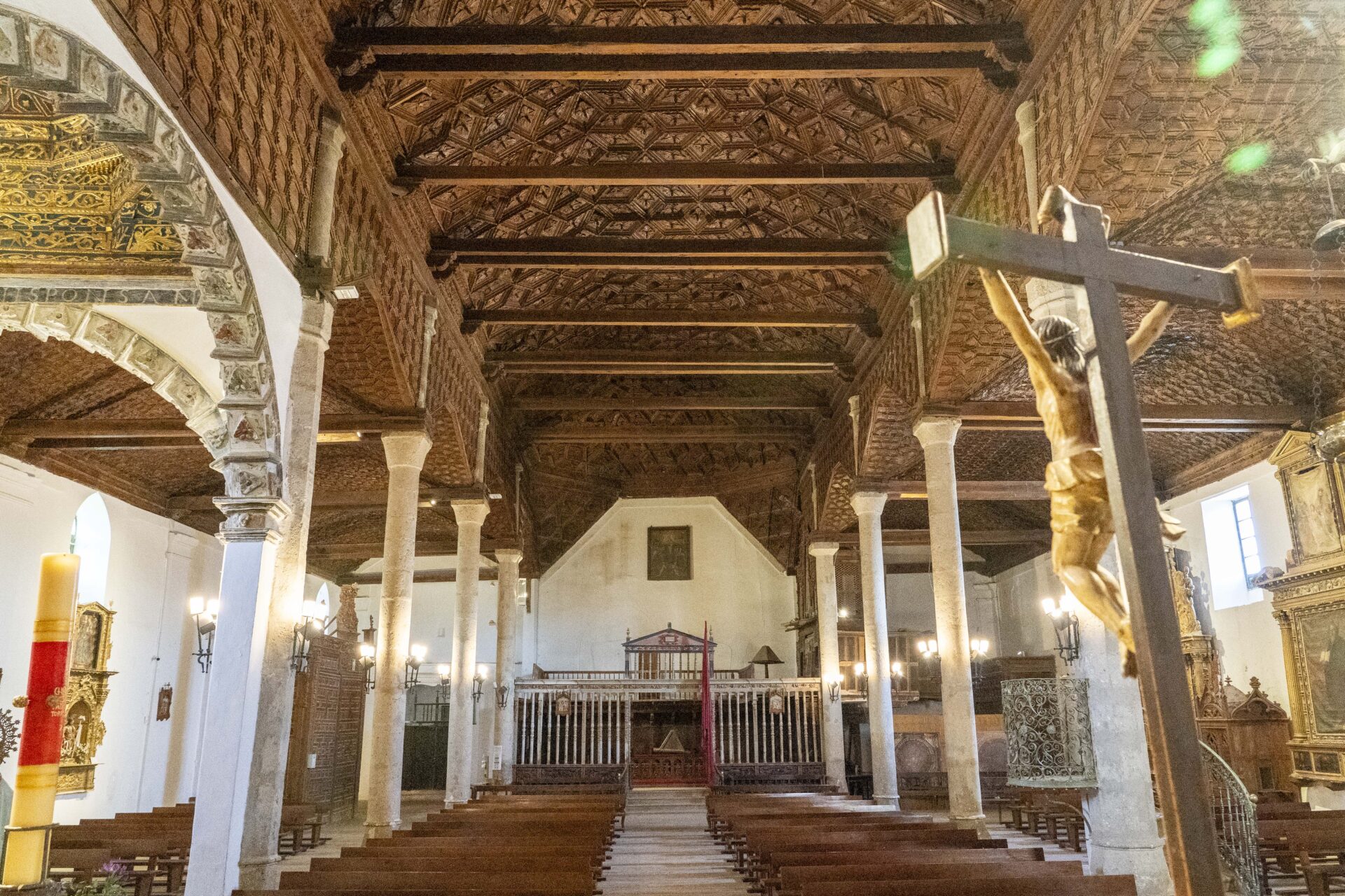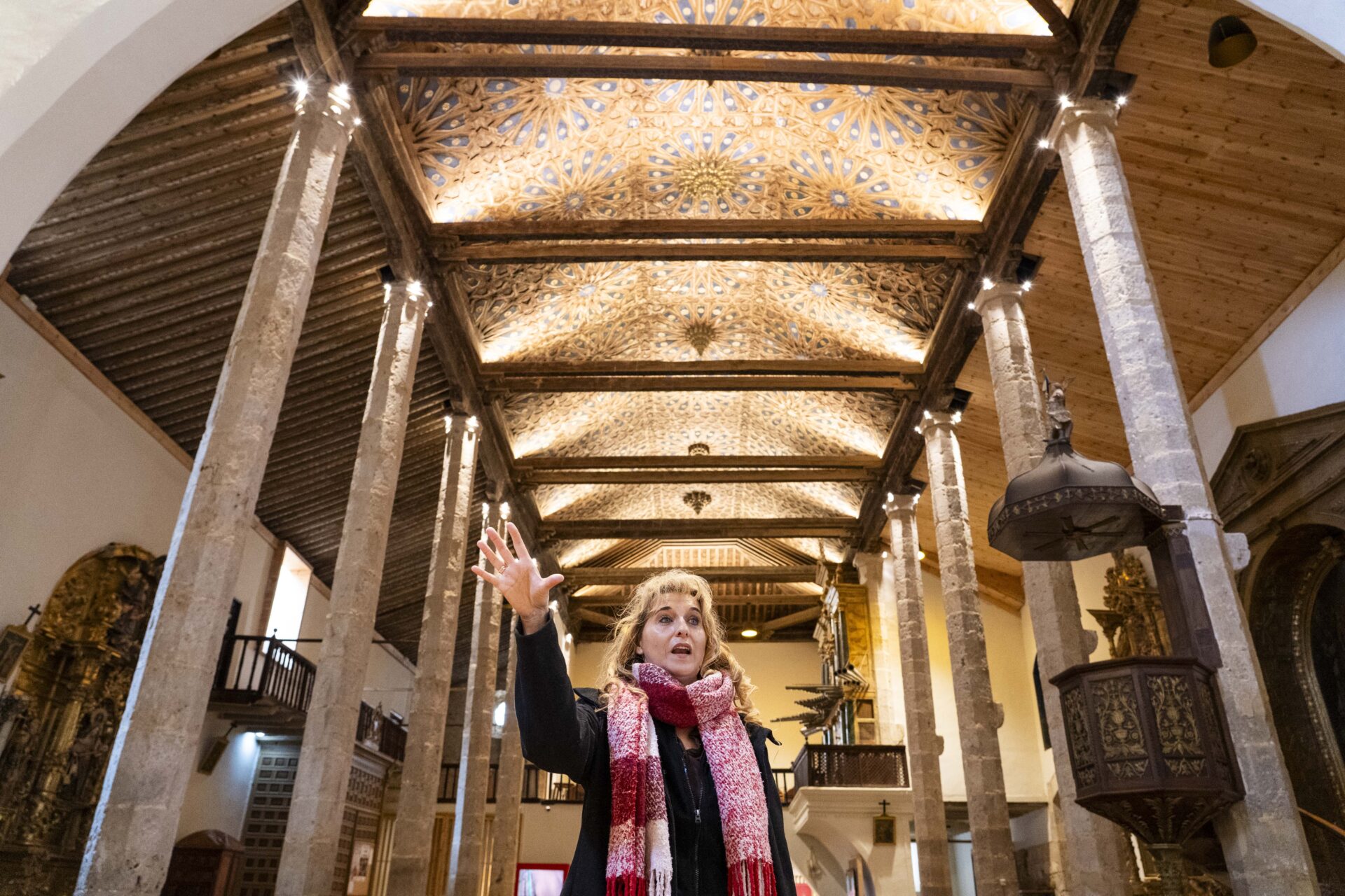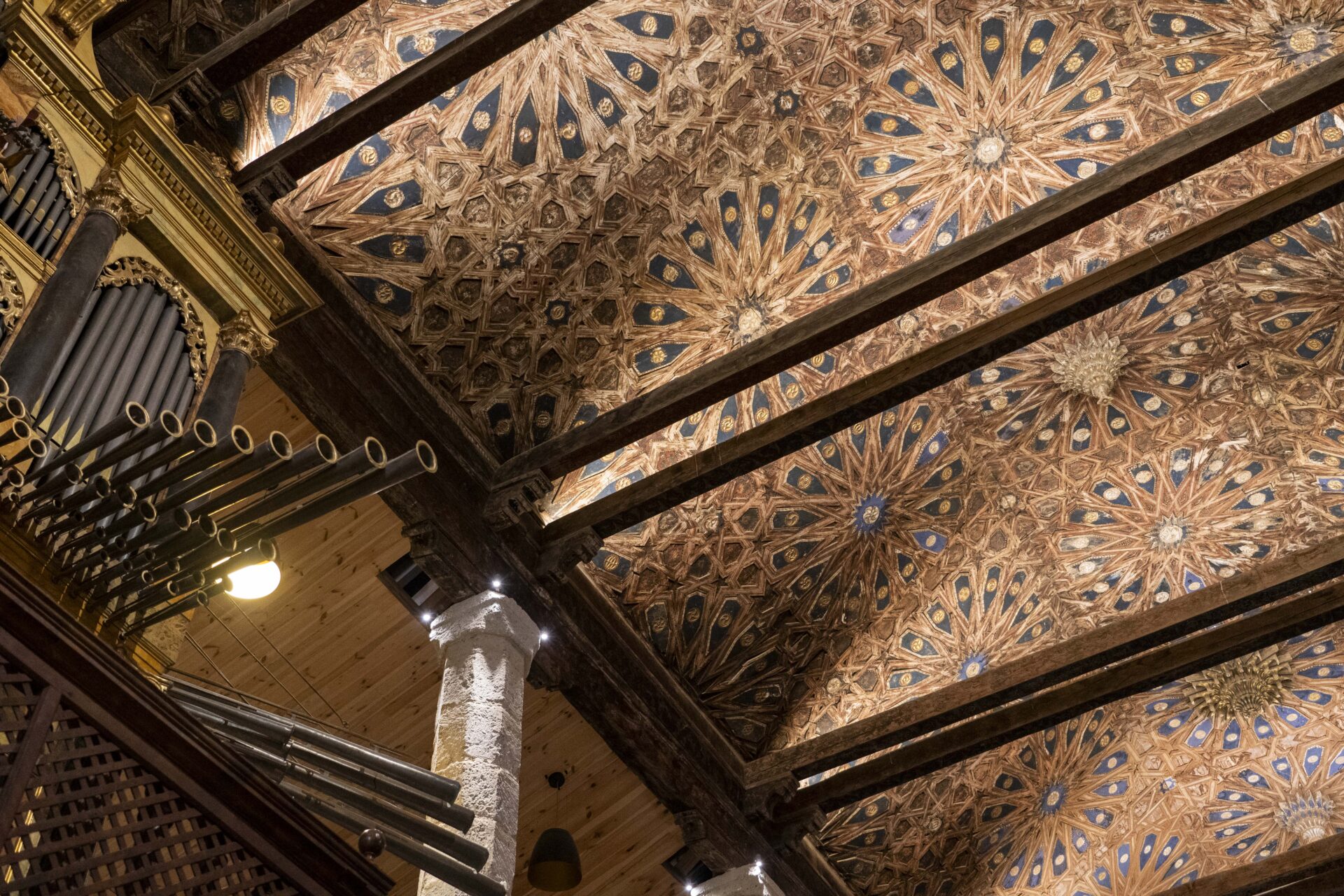 Bianca, la guía de esta iglesia con un artesonado tan peculiar, relata que la seo está construida en ladrillo entre finales del siglo XV y comienzos del XVI, y cuenta con tres naves separadas por pilares, con capiteles prismáticos muy toscos, sobre los que se elevan columnas que recogen las terchas de los artesones. En ella se encuentra la Capilla de la Virgen del Castillo y en el extremo opuesto de la misma nave, el baptisterio con bóveda estrellada. “Toda la iglesia está cubierta con artesonados mudéjares y policromados de principios del siglo XVI, de gran calidad y variedad”, resalta, para añadir que los artesonados mudéjares de la nave mayor son de casetones “romboidales, de lazo y de clave pinjante en el almizate y en el presbiterio; y con figuras estrelladas en el ochavado del primer tramo de la nave de la epístola”. El resto son de par y nudillo.