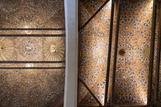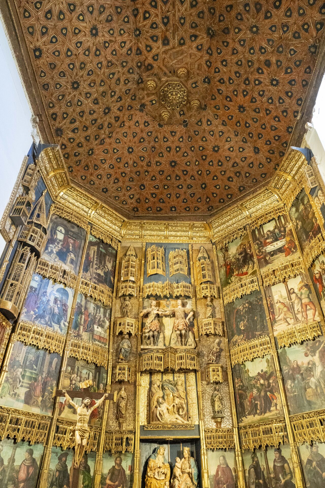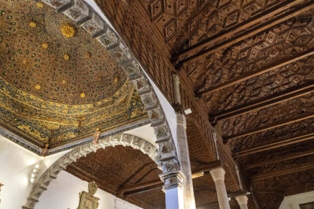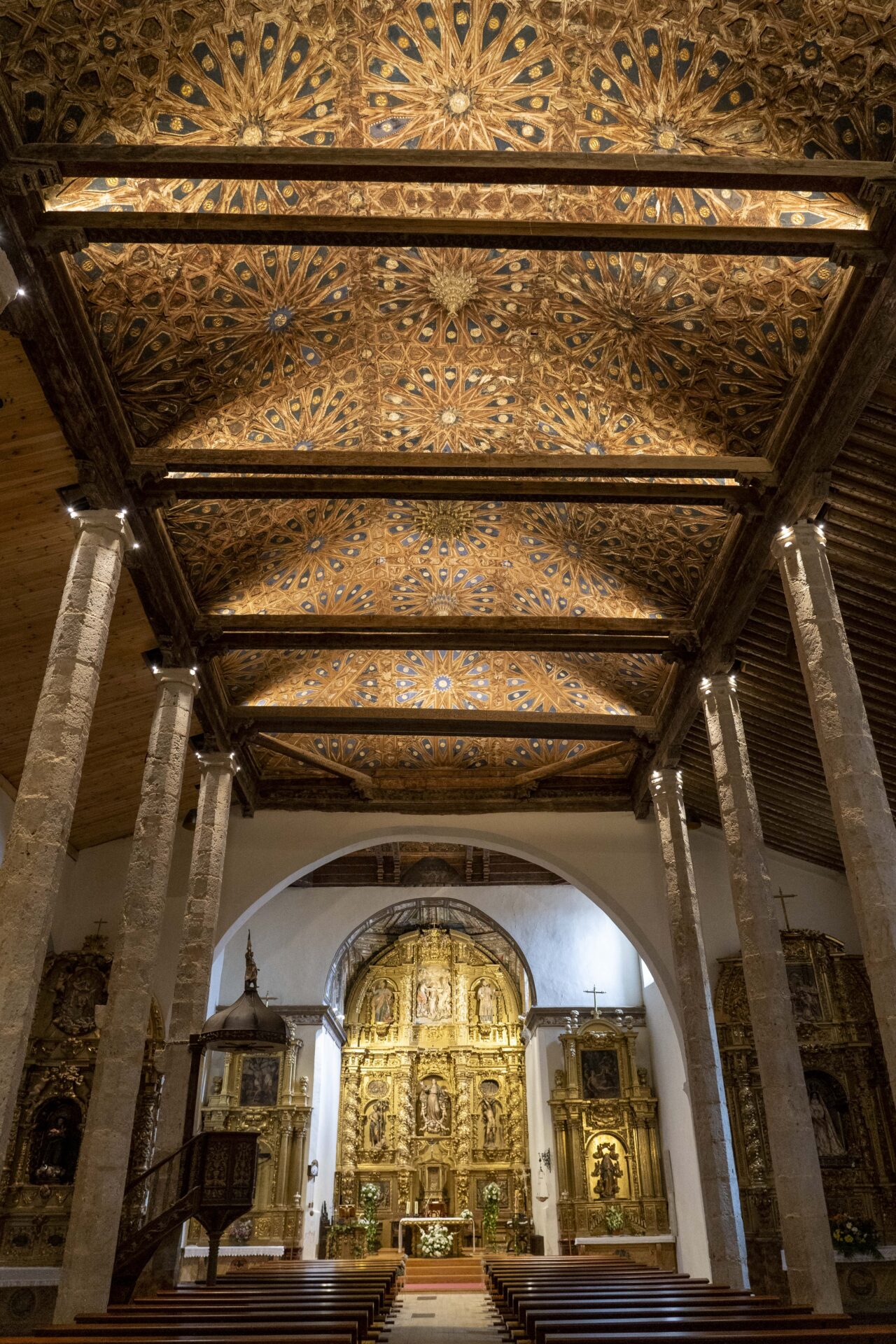 Bianca, la guía de esta iglesia con un artesonado tan peculiar, relata que la seo está construida en ladrillo entre finales del siglo XV y comienzos del XVI, y cuenta con tres naves separadas por pilares, con capiteles prismáticos muy toscos, sobre los que se elevan columnas que recogen las terchas de los artesones. En ella se encuentra la Capilla de la Virgen del Castillo y en el extremo opuesto de la misma nave, el baptisterio con bóveda estrellada. “Toda la iglesia está cubierta con artesonados mudéjares y policromados de principios del siglo XVI, de gran calidad y variedad”, resalta, para añadir que los artesonados mudéjares de la nave mayor son de casetones “romboidales, de lazo y de clave pinjante en el almizate y en el presbiterio; y con figuras estrelladas en el ochavado del primer tramo de la nave de la epístola”. El resto son de par y nudillo.