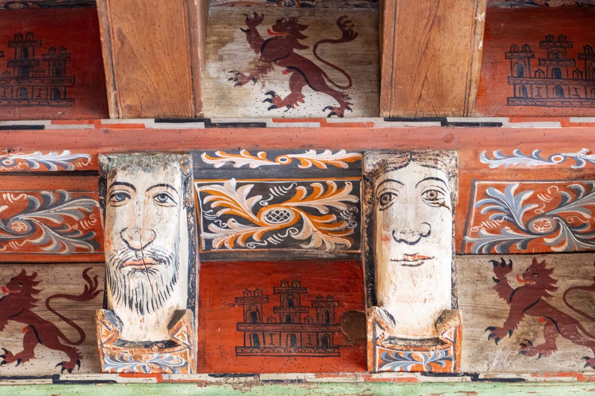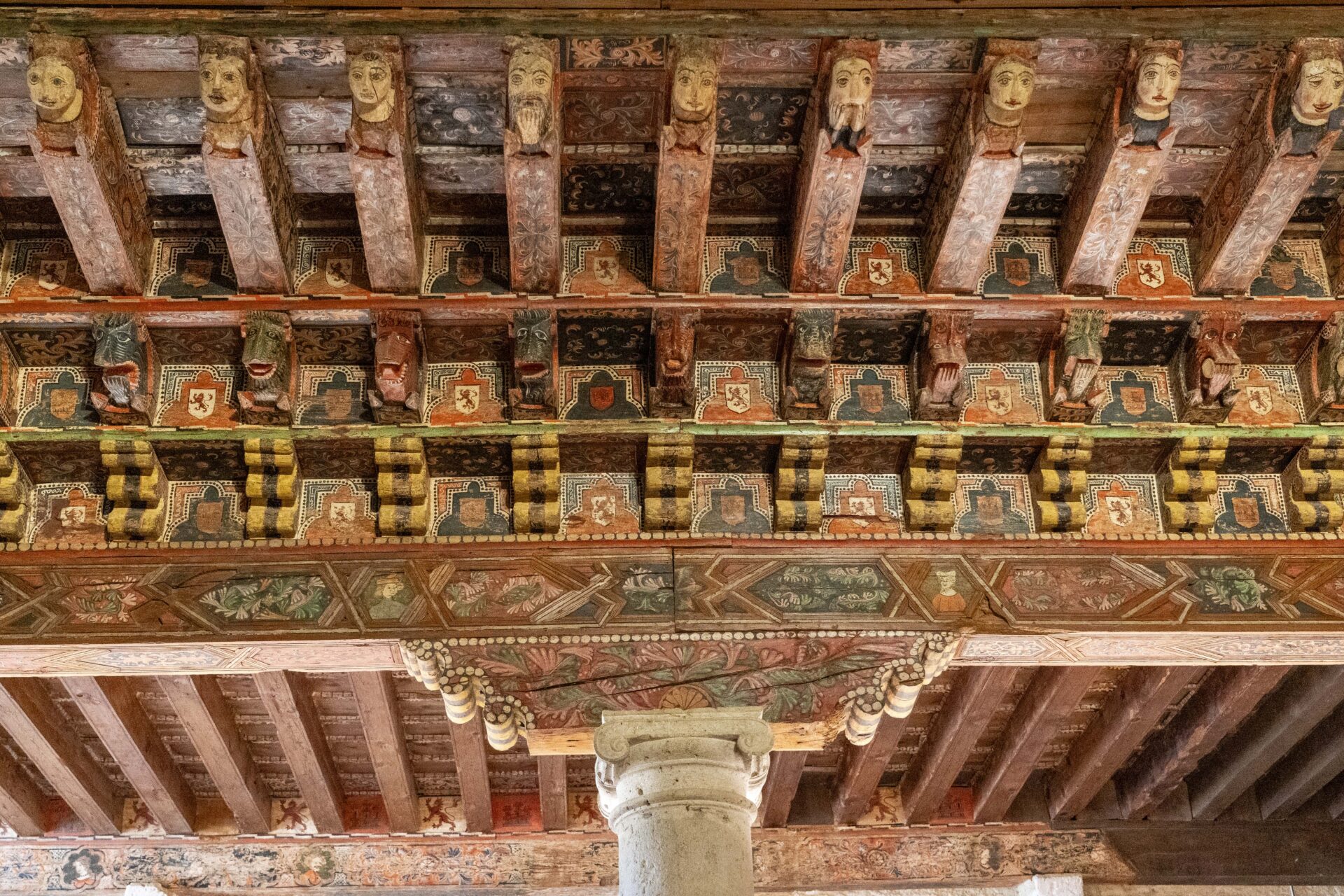 Vicente analiza que se estructura en tres niveles de canecillos: los del más bajo son de forma lobulada simple; el siguiente posee varias figuras animales, muchos de ellos fantásticos; y el último remata con rostros humanos de hombres, que como definió el profesor Lavado, unos “tienen barbas, perilla o bigote, y de mujeres, con collares y escotes”. Todo el fondo de este alfarje está salpicado de elementos decorativos vegetales y escudos alternados de Castilla y de León.