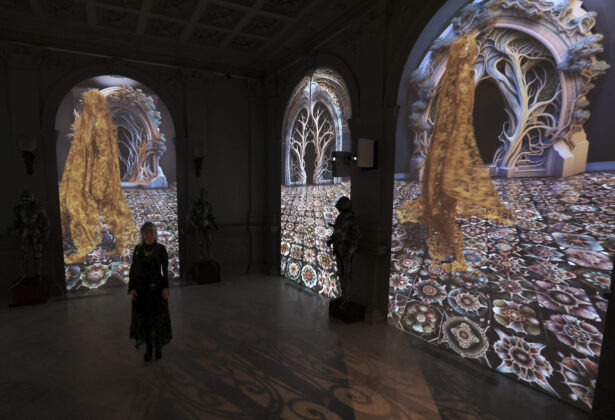 En el comedor de gala propone su serie ‘Historia natural’, donde da forma a una suerte de “mujeres aire/agua”, mientras que en los antiguos dormitorios ha creado una serie de ninfas ingrávidas sobre pan de oro con el título ‘Gótico 1’. El antiguo recibidor ha sido ocupado por bajorrelieves en latón titulados ‘Envidia’, mientras que la visita concluye en el zaguán, donde pueden contemplarse sus vídeos llamados ‘Las herboristas’, cinco creaciones proyectadas sobre otras tantas pantallas que tapan los ventanales del espacio que cobija armaduras históricas, en las que aparecen mujeres cuyas pieles se funden con sus mantos, con encajes dorados y motivos decorativos vegetales.