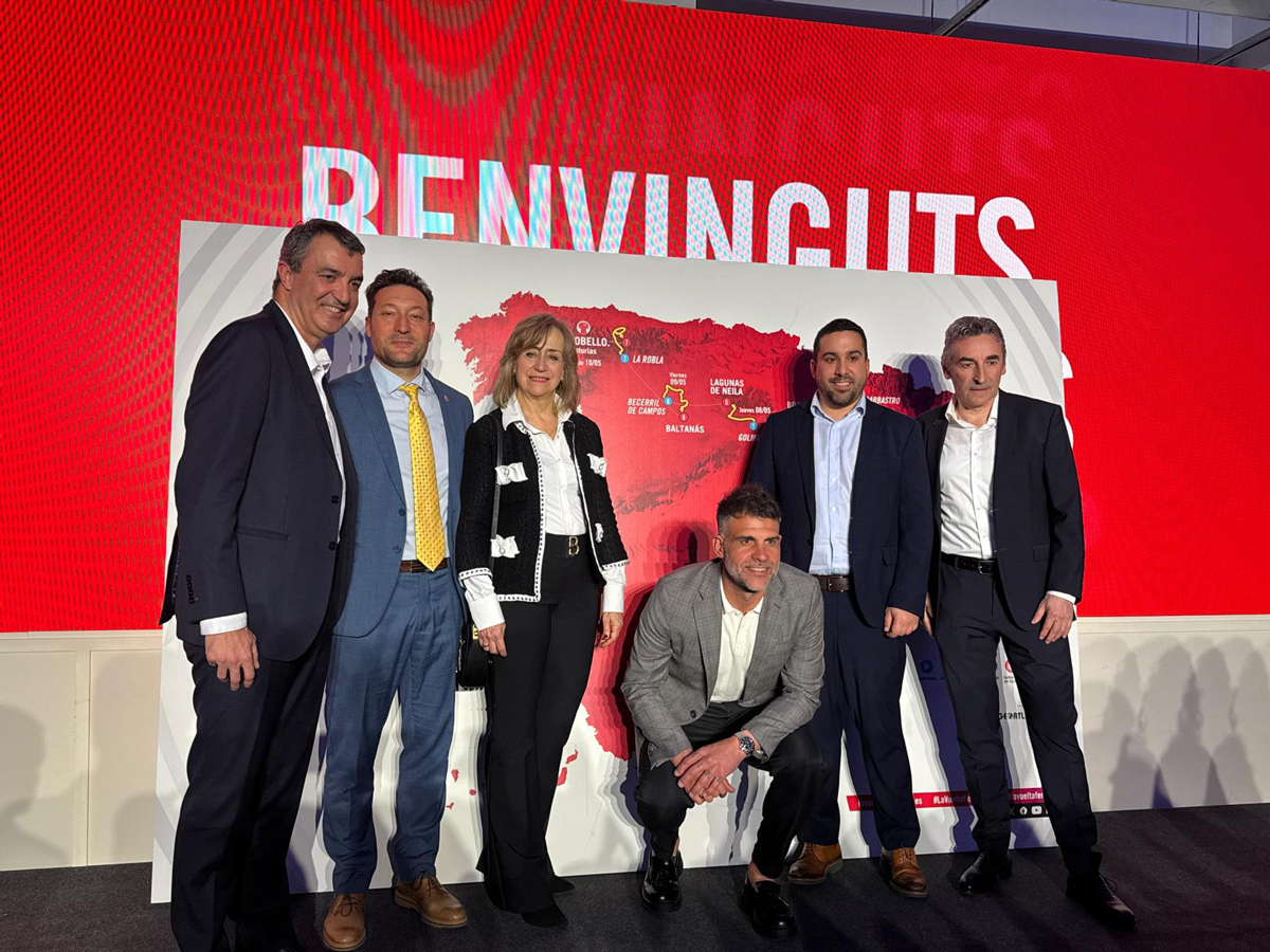 La vicepresidenta Primera y alcaldesa de Baltanás, María José de la Fuente, el diputado de Desarrollo Socioeconómico, Turismo y Deportes y alcalde de Becerril, Francisco Pérez y el diputado de Deportes y alcalde de Melgar de Yuso, Eduardo Tejido han asistido a la presentación del recorrido de La Vuelta Femenina 25 by Carrefour.es: que ha tenido lugar en Barcelona.