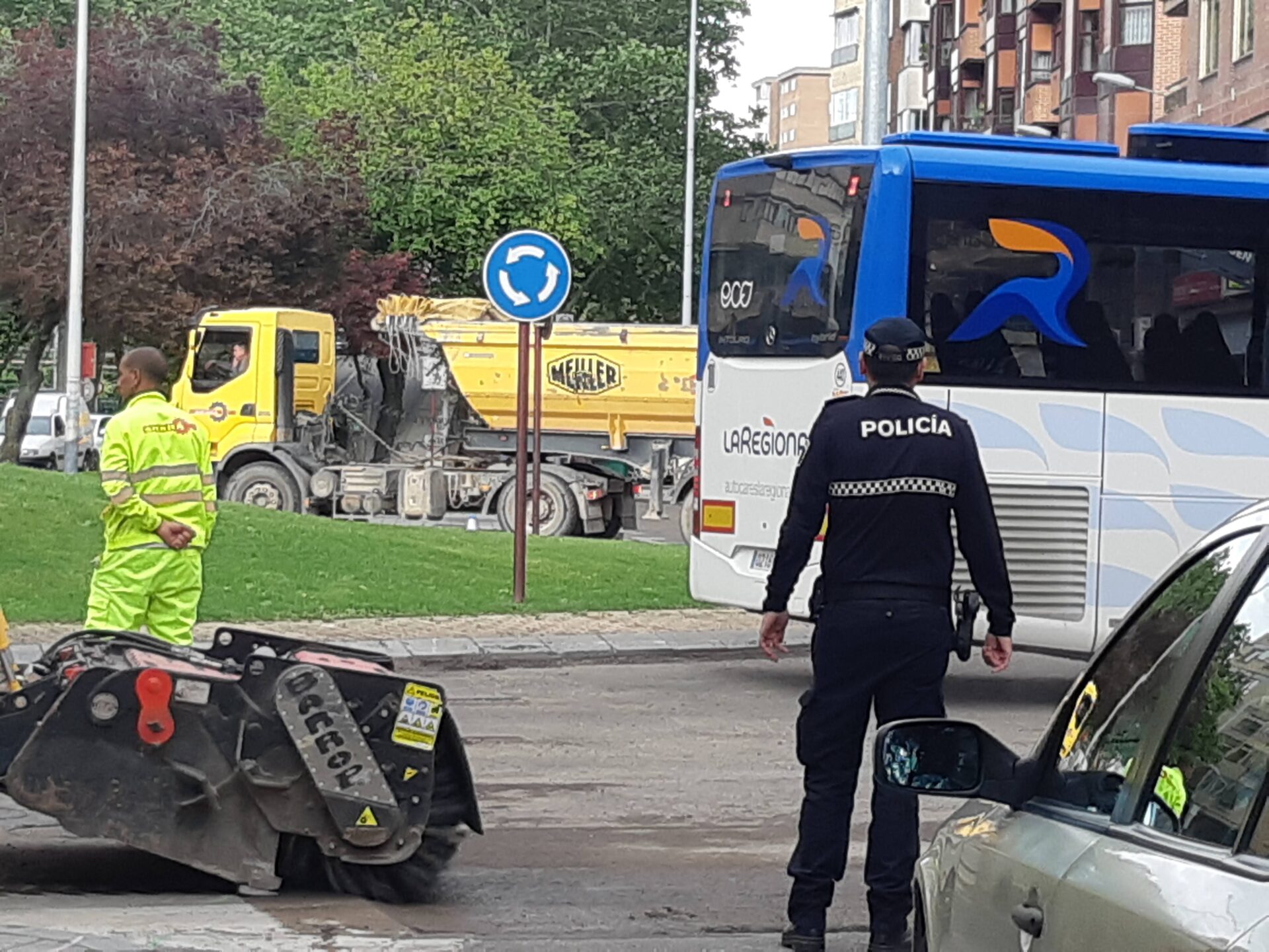 Un efectivo de la Policía Local de Palencia vigila el desarrollo de unas obras en San Lázaro. / Óscar Herrero