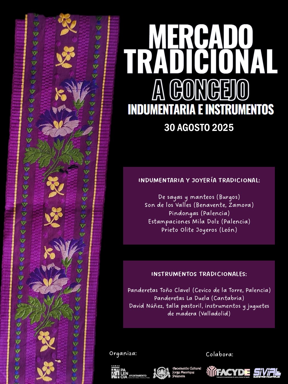 El programa arrancará el sábado 30 de agosto a partir de las 11:30 horas en la Plaza Mayor, con la inauguración del Mercado Tradicional de Indumentarias e Instrumentos donde ocho artesanos procedentes de Palencia, Burgos, Zamora, León, Cantabria y Valladolid ofrecerán al público la oportunidad de poder adquirir indumentaria tradicional, pañería, panderetas, artículos de joyería, juguetes de madera o estampaciones. Más concretamente, los participantes son ‘De sayas y manteos’ (Burgos); Son de los Valles (Benavente, Zamora); Pindongas (Palencia); Estampaciones Mila Dolz (Palencia); Prieto Olite Joyeros (León); Panderetas Toño Clavel (Cevico de la Torre. Palencia); Panderetas La Duela (Cantabria); David Núñez, talla pastoril, instrumentos y juguetes de madera (Valladolid).