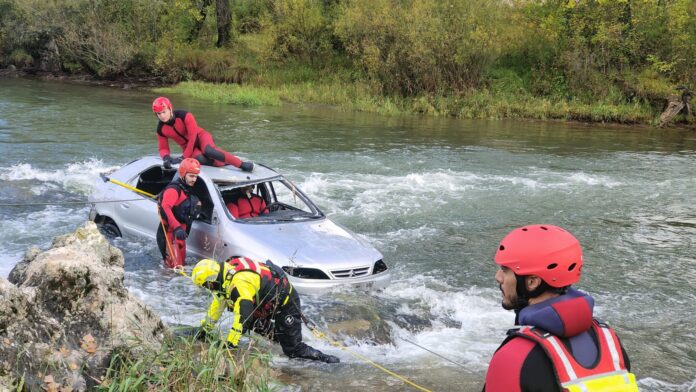 El curso de aguas bravas del río Esla en Sabero (León) ha sido el paraje natural elegido por la Agencia de Protección Civil y Emergencias para simular una riada que provoca la caída de un vehículo al río y que requiere la intervención de los bomberos.