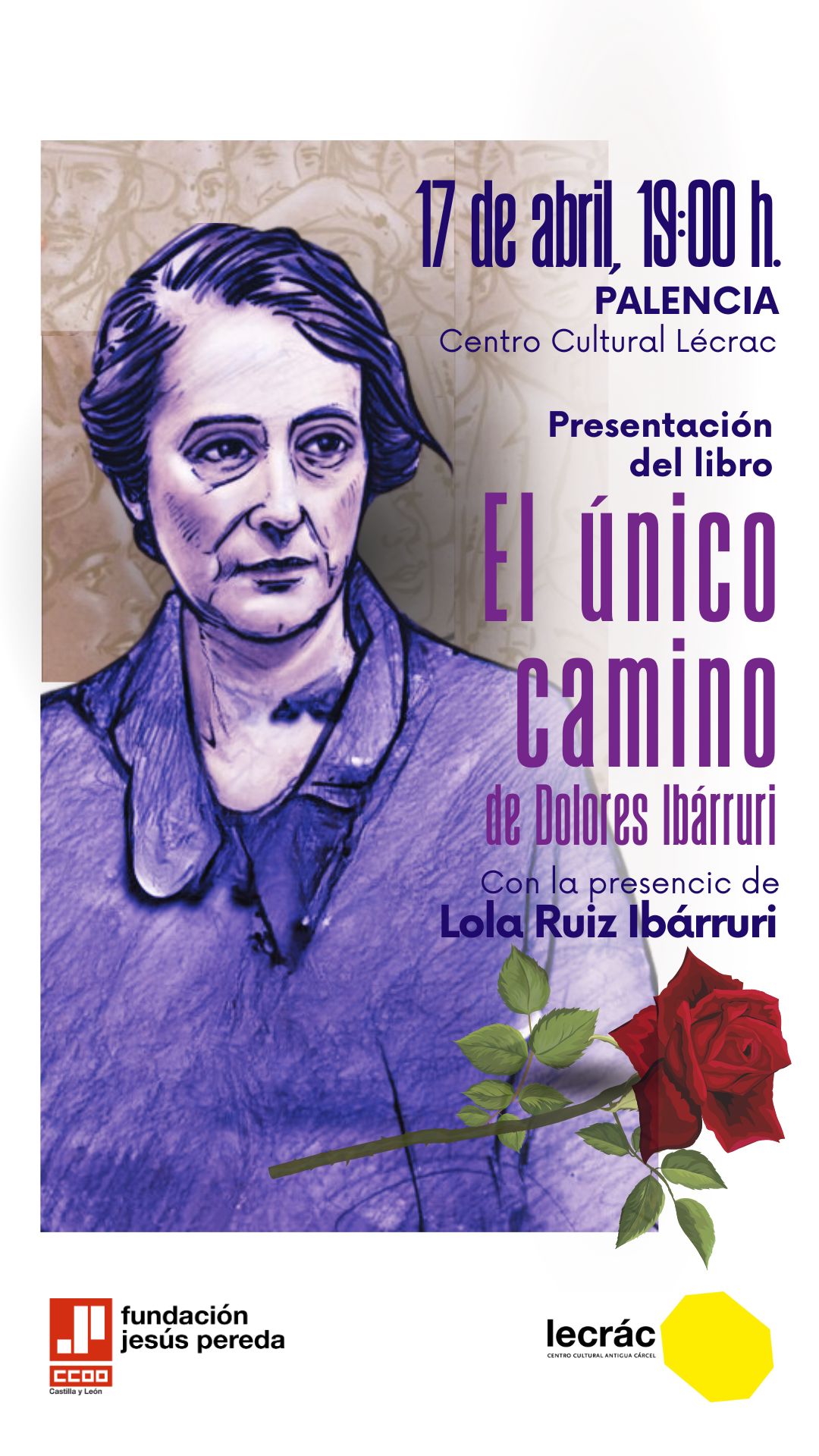 En esta ocasión, presentamos junto a CCOO Palencia y al Partido Comunista, “El único camino”, de Dolores Ibárruri y Amaya Ruiz Ibárruri en el Centro Cultural Lécrac, el miércoles 17 de abril a las 19h00, para lo cual contaremos con la participacion de Lola Ruiz-Ibárruri Sergueyeva, nieta de la Pasionaria y depositaria de buena parte del legado y del archivo personal de su abuela.