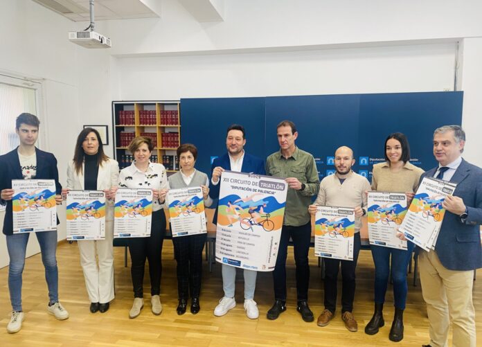 El Diputado de Deportes, Eduardo Tejido, junto al Coordinador de Deportes de la Diputación, Enrique Hermoso, el presidente de la Federación de Castilla y León de Triatlón, Amancio del Castillo, y los alcaldes o concejales de los municipios participantes y de los organizadores de los distintos triatlones, han presentado una nueva edición del exitoso Circuito de Triatlón Diputación de Palencia.