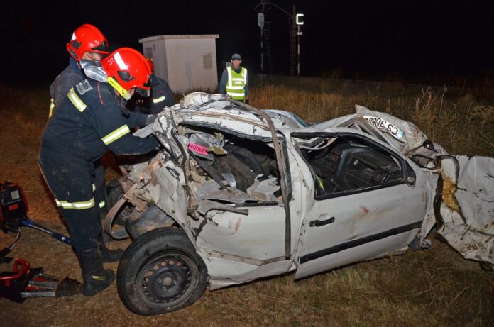 Una cizalla hidráulica de los bomberos de la Diputación junto a un vehículo accidentado. / ICAL