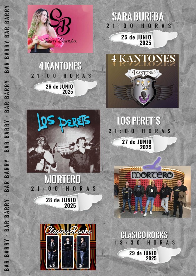El Bar Barry celebrará su 55 aniversario del 25 al 29 de junio con una semana de conciertos. Actuarán Sara Bureba, 4 Kantones, Los Peret’s, Mortero y Clásico Rocks, marcando el inicio del verano