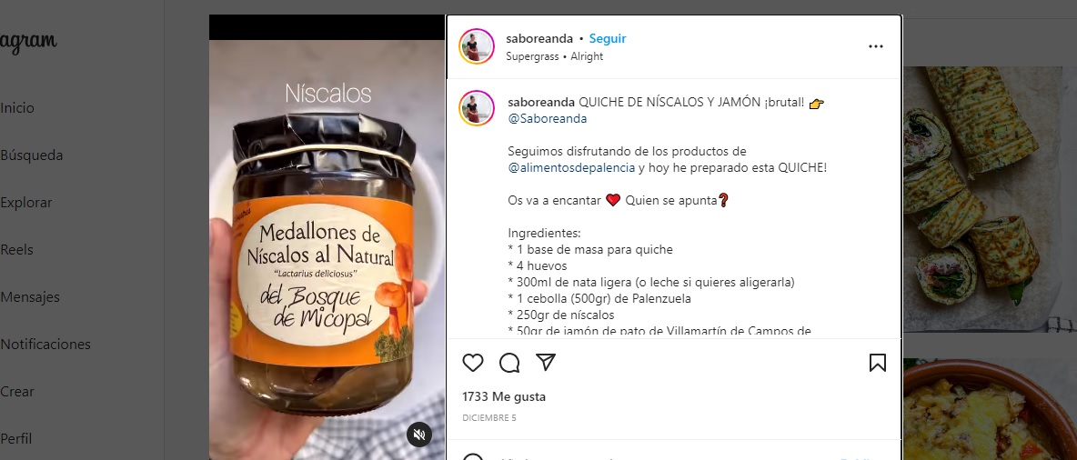 Saboreanda (María Albero) cuenta con 300.000 seguiodores en su cuenta de Instragram. En su cuenta se encuentran publicados post llenos de recetas fáciles para cada día. En esta acción con Alimentos de Palencia Saboreanda ya ha elaborado dos recetas con productos vegetales y embutidos, enseñando a su comunidad cómo hacerlos.