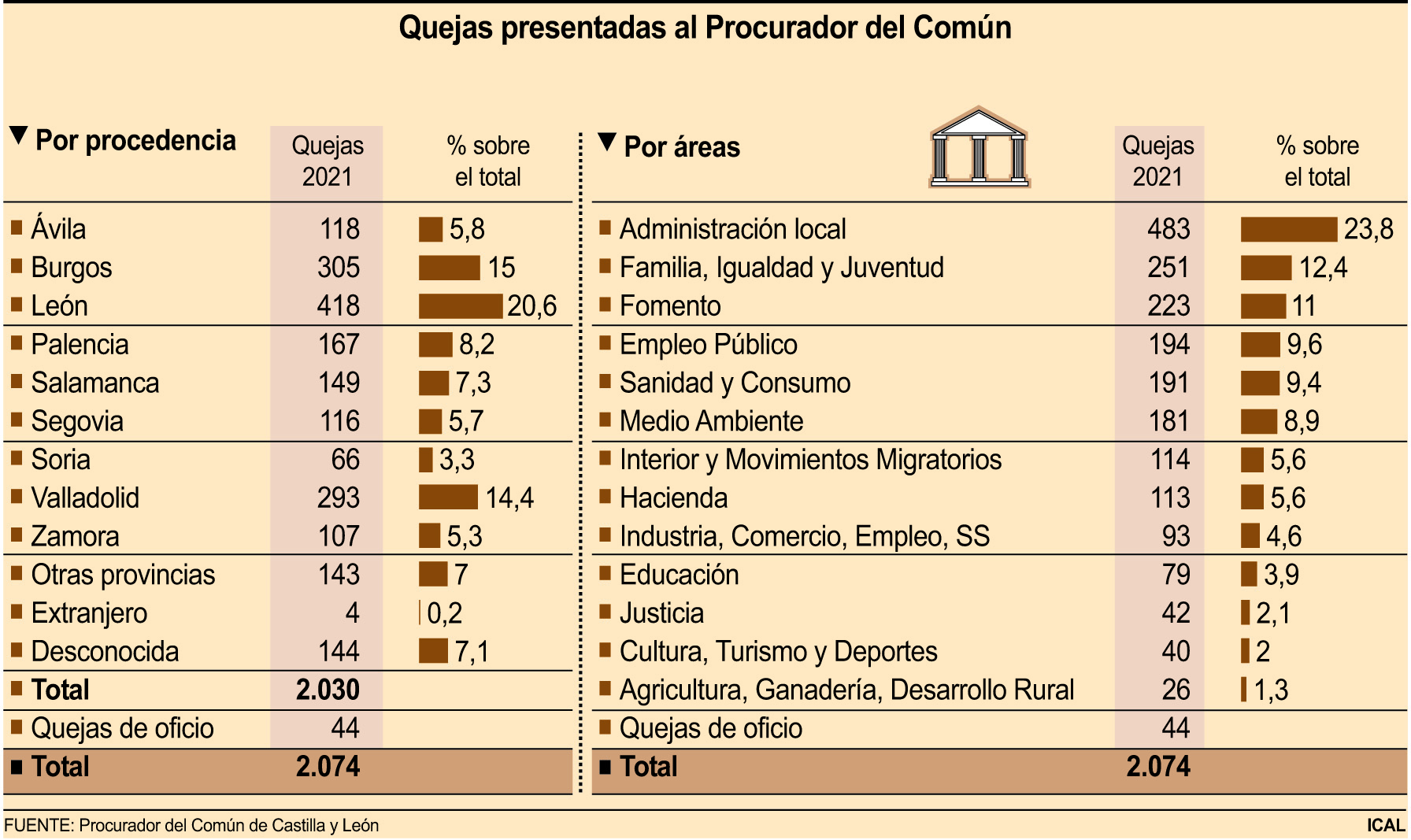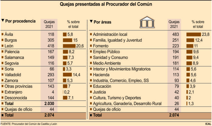 Por provincias, León volvió a liderar el número de quejas con 418, lo que supone un 20,5 por ciento del total, seguida de Burgos con 305 (15 por ciento), Valladolid con 293 (14,4 por ciento), Palencia con 167 (8,23 por ciento), Salamanca 149 (7,34 por ciento), Ávila con 118 (5,81 por ciento), Segovia con 116 (5,71 por ciento), Zamora con 107 (5,27 por ciento) y Soria con 66 (3,25 por ciento).
