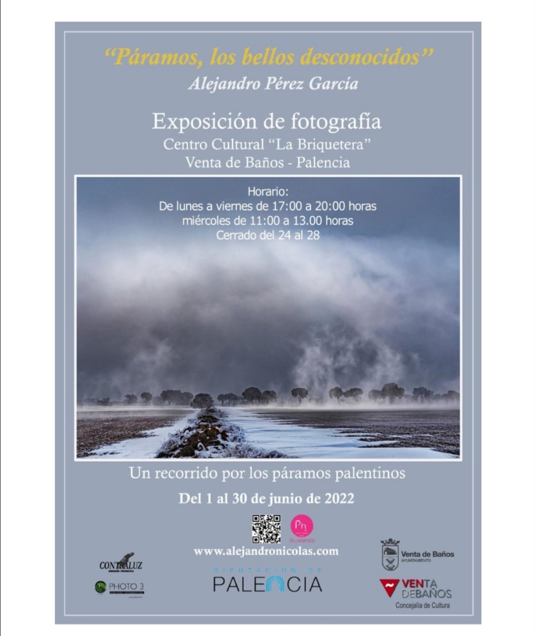 Desde el Ayuntamiento de Venta de Baños, a través de la Concejalía de Cultura invitan a ver y sentir del 1 al 30 de junio, en la Sala de Exposiciones del Centro Cultural “La Briquetera” la exposición de fotografía “Páramos, los bellos desconocidos” de Alejandro Pérez García, en el siguiente horario: de lunes a viernes de 17:00 a 20:00 horas y el miércoles de 11:00 a 13:00 horas y permanecerá cerrado del día 24 al día 28.