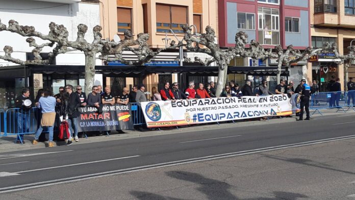 Dos colectivos le esperaban al ministro del Interior, Fernando Grande-Marlaska, a su llegada a Palencia. Colocados al otro lado de la avenida de Valladolid, frente al Lecrac, lanzaron su proclamas para recabar unas mejoras en la seguridad de los funcionarios de prisiones y la equiparación salarial de las Fuerzas y Cuerpos de Seguridad del Estado.