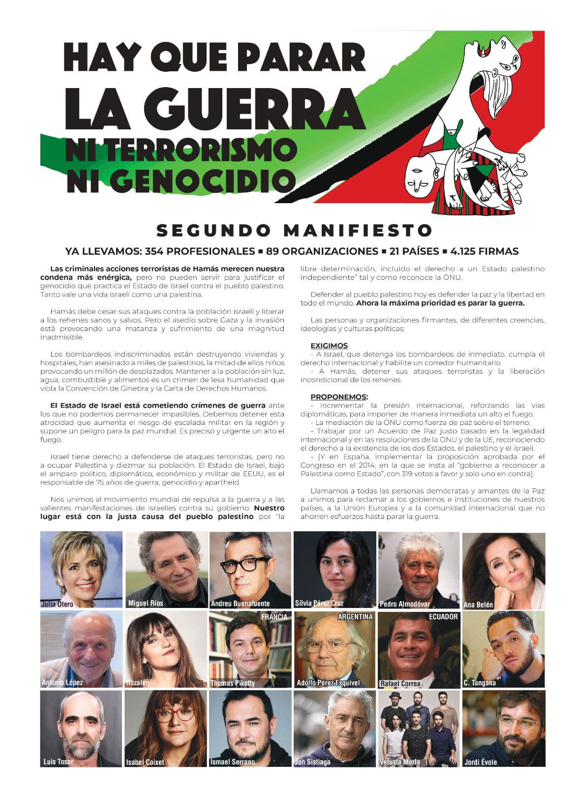 El manifiesto afirma que ‘nuestro lugar está con la justa causa del pueblo palestino por “la libre determinación, incluido el derecho a un Estado palestino independiente” tal y como reconoce la ONU’ y concluye con dos tipos de peticiones. Una exigencia, ‘a Israel, que detenga los bombardeos de inmediato, cumpla el derecho internacional y habilite un corredor humanitario’ y a Hamás que detenga ‘sus ataques terroristas y la liberación incondicional de los rehenes’. Además, propone el alto el fuego, la mediación de la ONU, un acuerdo basado en la existencia de los dos Estados, y la implementación de la proposición aprobada por el Congreso en el 2014, en la que se insta al “gobierno a reconocer a Palestina como Estado”.