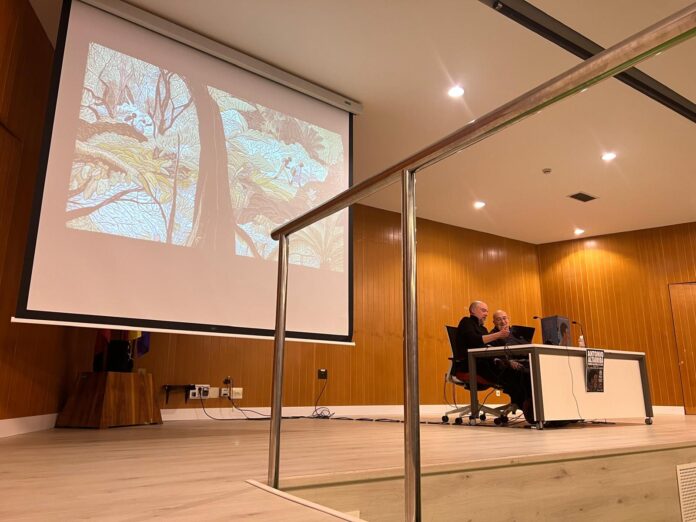 “Narrativamente muy rico, con un montaje experimental”, apuntó el dibujante palentino Félix Velasco, que se encargó de dirigir la charla con el autor aragonés, quien se mostró encantado de volver a Palencia con sus compañeros autores, un guante que recogieron tanto la Biblioteca Pública de Palencia como la Librería J.M. de la capital, culpables directos de la presencia ayer de Altarriba.