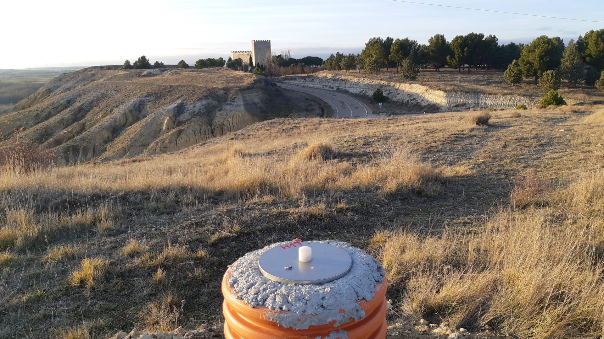 Con los hitos de replanteo ya colocados sobre el terreno se puede comprobar que el castillo queda realmente cerca. Los datos del Sigpac muestran menos de 340 metros entre el hito de construcción y el castillo, propiedad de la Diputación. Lo justo para no interferir en la carretera de acceso la Bien de Interés Cultural.