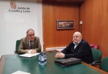 La presidenta de la Diputación de Palencia, Ángeles Armisén, acompañada del diputado de zona, Luis Calderón, se ha reunido en el Palacio Provincial con el alcalde de Meneses de Campos, Miguel Camina, para estudiar diversos asuntos que tienen que ver con su labor al frente del municipio.