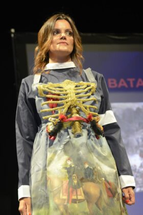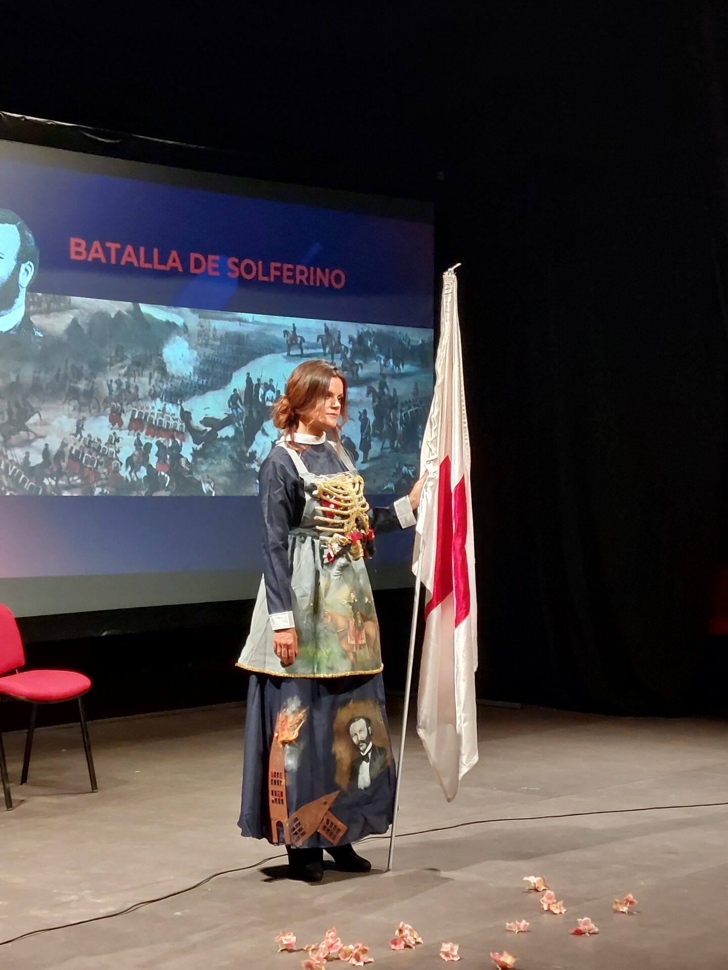 Vestido-cuadro en honor a los “Recuerdos de Solferino”, la batalla que inspiró a Henry Dunant a fundar Cruz Roja, simbolizando los orígenes y la evolución de esta organización humanitaria.