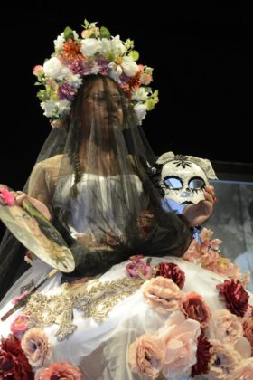 Vestido-cuadro Violencia Machista: Con referencias a la obra de Frida Kahlo, “Unos cuantos piquetitos”, este vestido denuncia la violencia doméstica y subraya la importancia de la protección y empoderamiento de las mujeres.