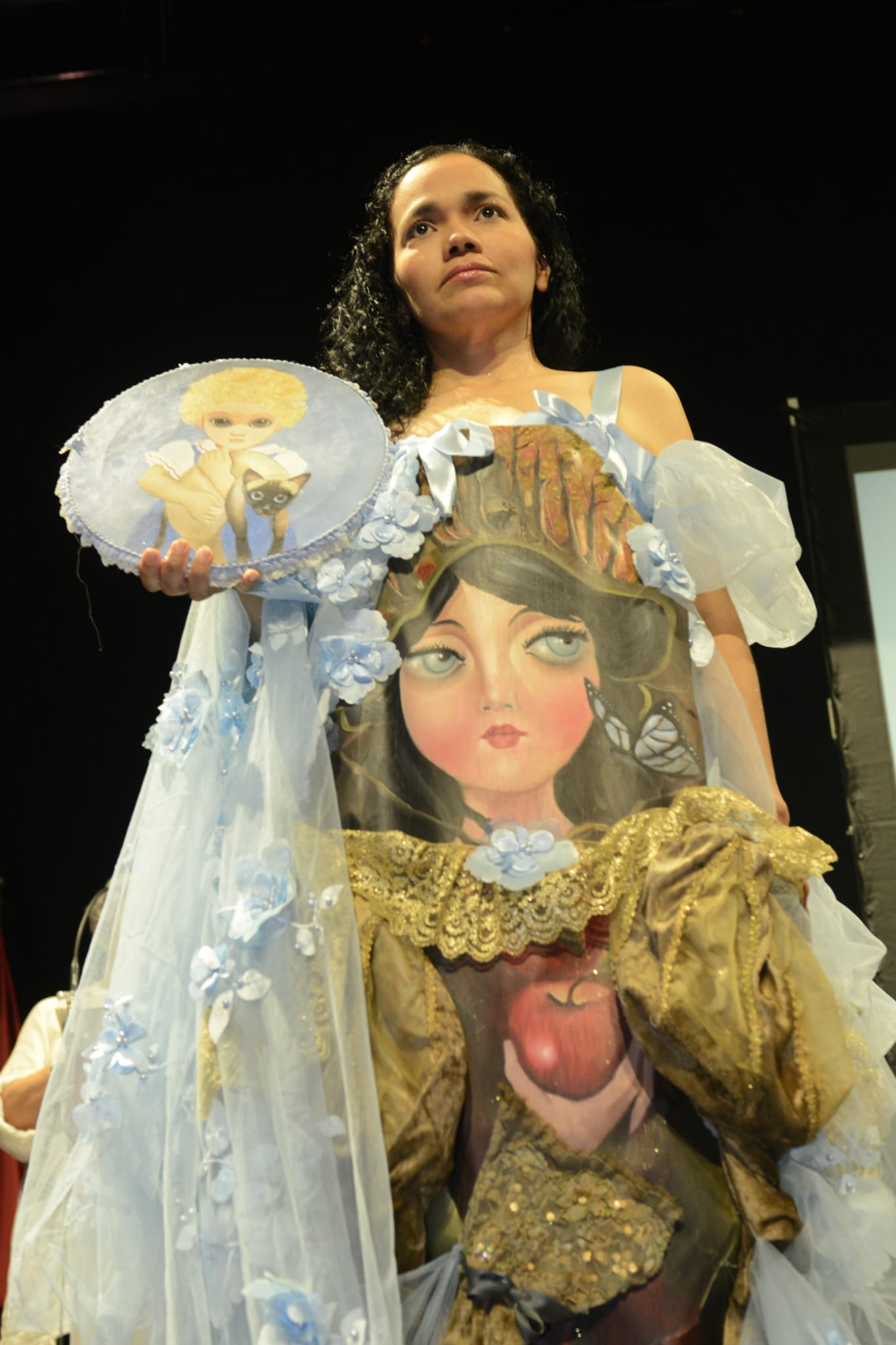 Vestido-cuadro Infancia: Los “ojos grandes” de las pinturas de Margaret Keane se reflejan en un vestido que simboliza la vulnerabilidad y la inocencia de los niños, destacando la labor de Cruz Roja en la protección infantil.