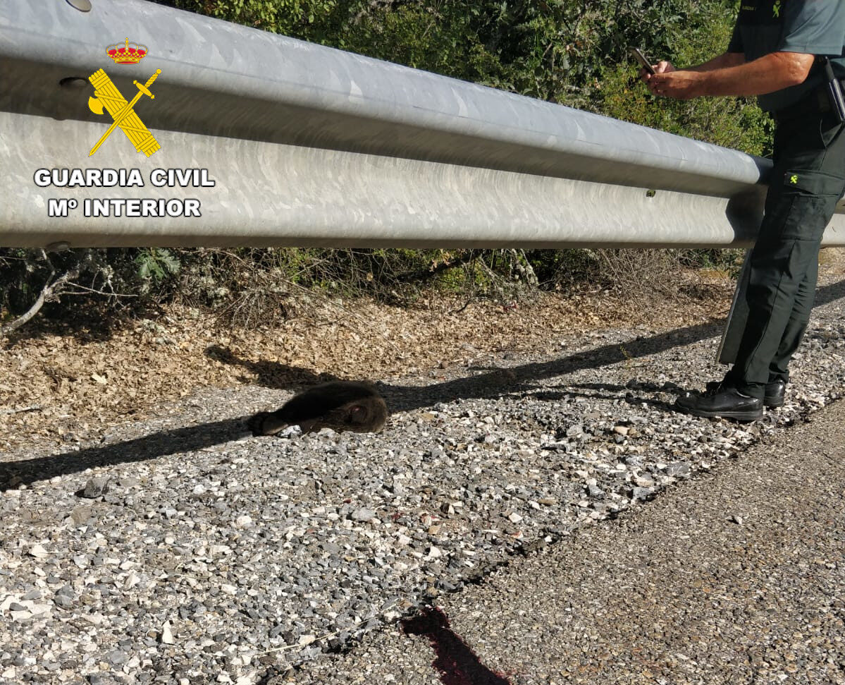 El animal en cuestión es una cría de oso pardo (hembra), 7-8 Kg, 80 cm. de tamaño, con sangre en boca y paletilla, indicó la Guardia Civil.