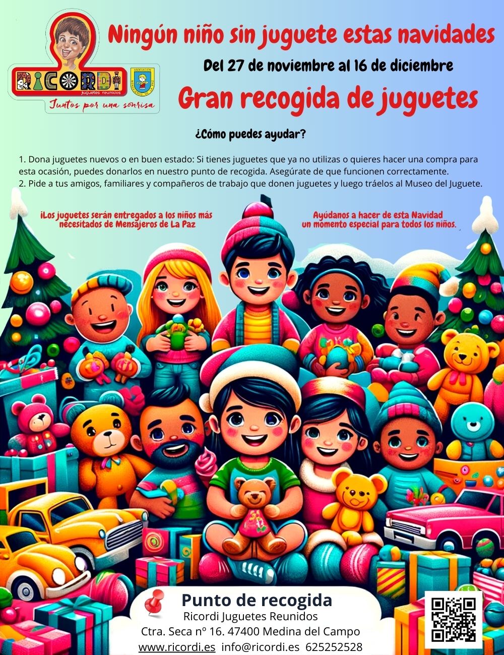 Ricordi Juguetes Reunidos, el Museo del Juguete de Medina del Campo, está organizando una campaña de recogida de juguetes para los niños más necesitados de Mensajeros de la Paz. La campaña empieza el lunes 27 de noviembre y se extenderá hasta la mañana del sábado 16 de diciembre. El objetivo es que estas Navidades ningún niño se quede sin juguete y todos tengan un regalo especial durante las fiestas.