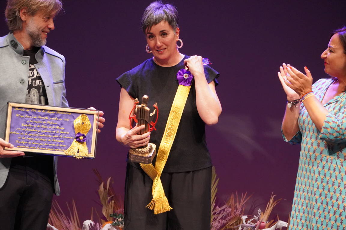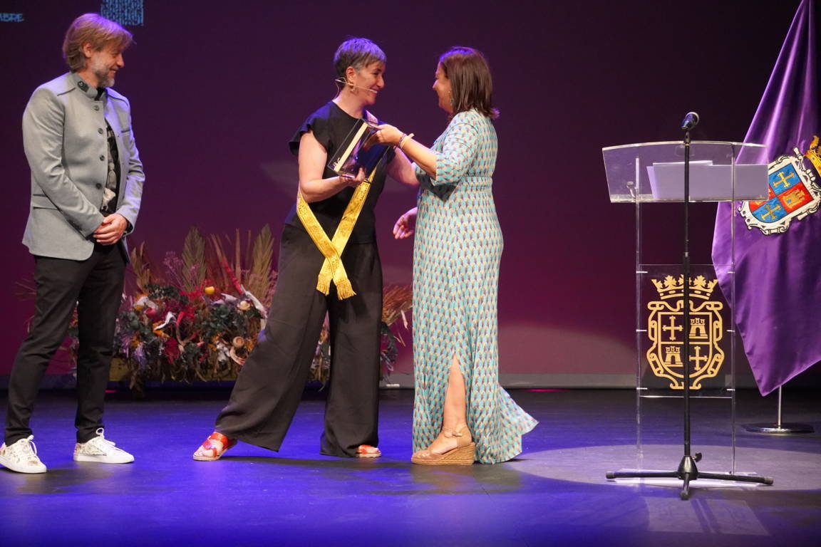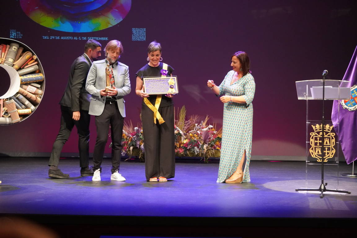 La alcaldesa y el concejal subieron de nuevo al escenario para hacer entrega a la pregonera de un obsequio conmemorativo: una miniatura en homenaje a la mujer palentina y de un Cristo del Otero con una ilustración de Villamuza entre sus manos.