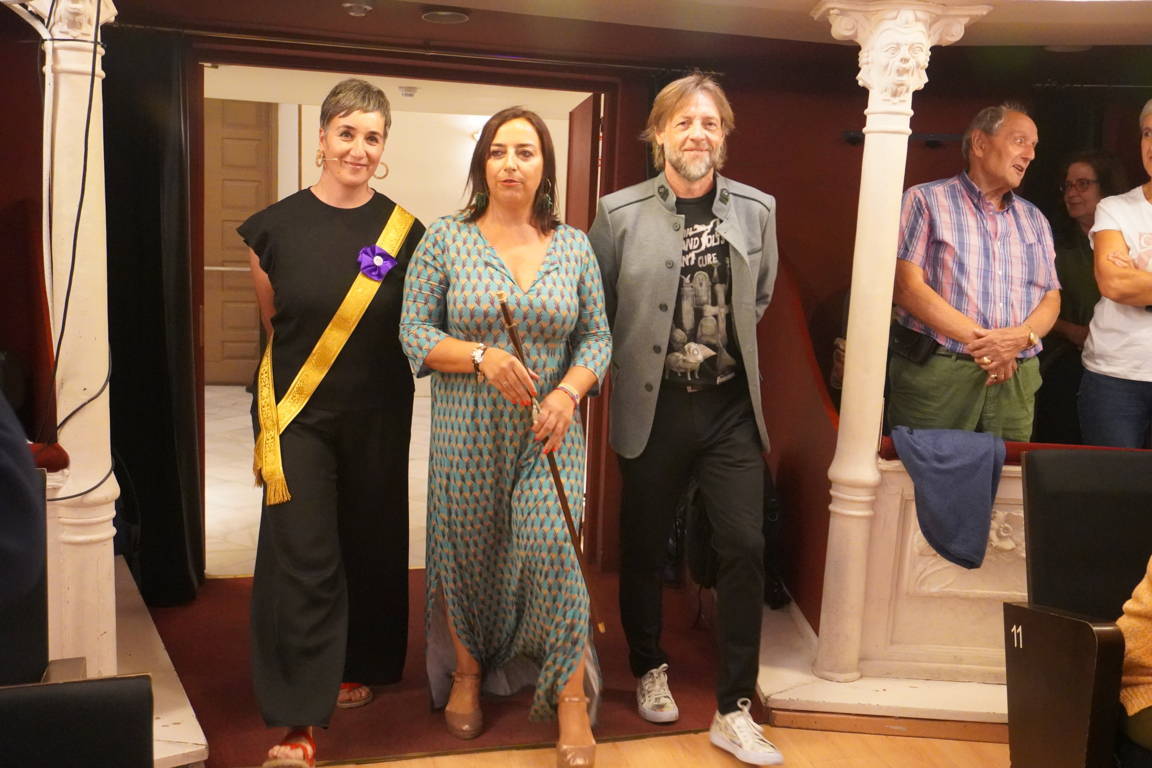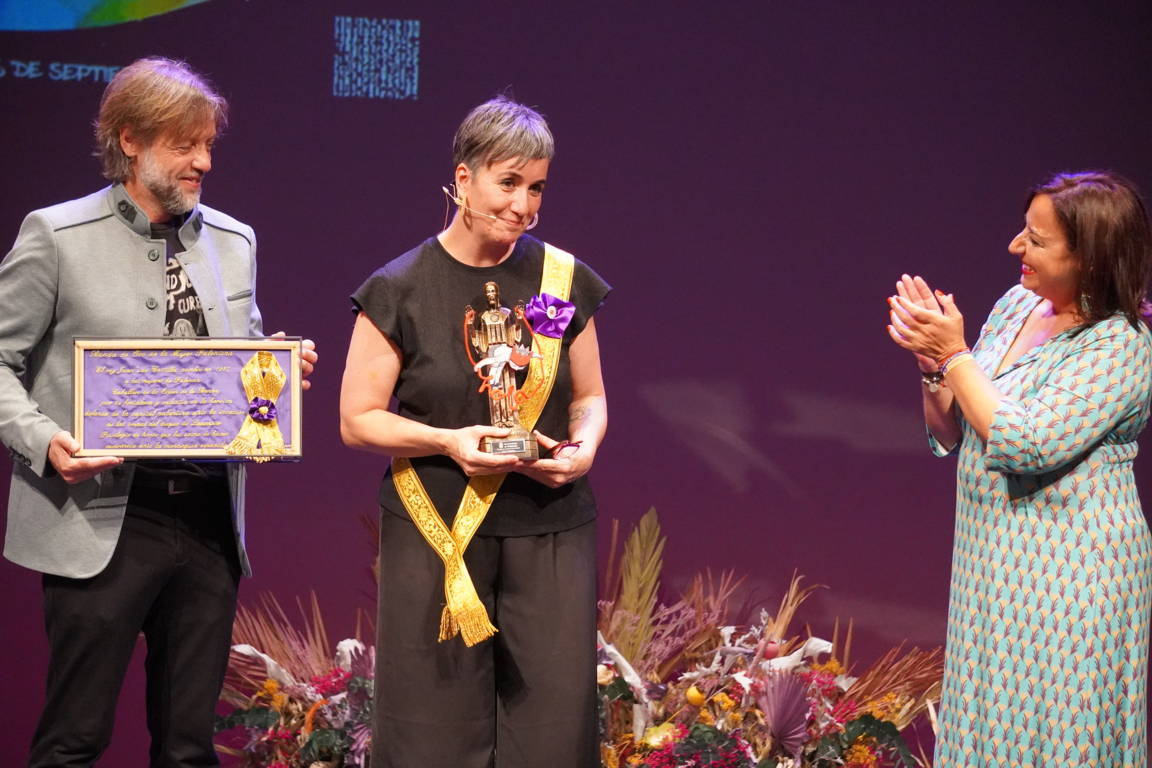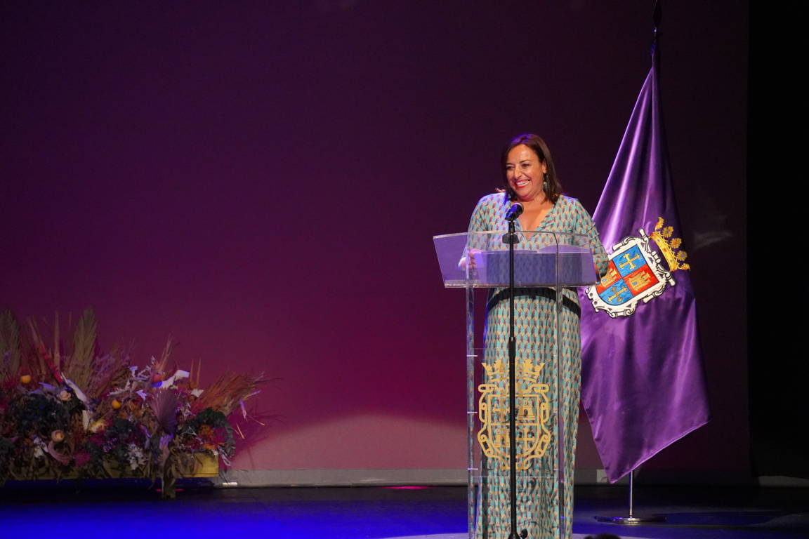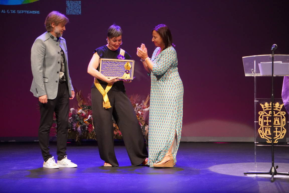 La alcaldesa y el concejal subieron de nuevo al escenario para hacer entrega a la pregonera de un obsequio conmemorativo: una miniatura en homenaje a la mujer palentina y de un Cristo del Otero con una ilustración de Villamuza entre sus manos.