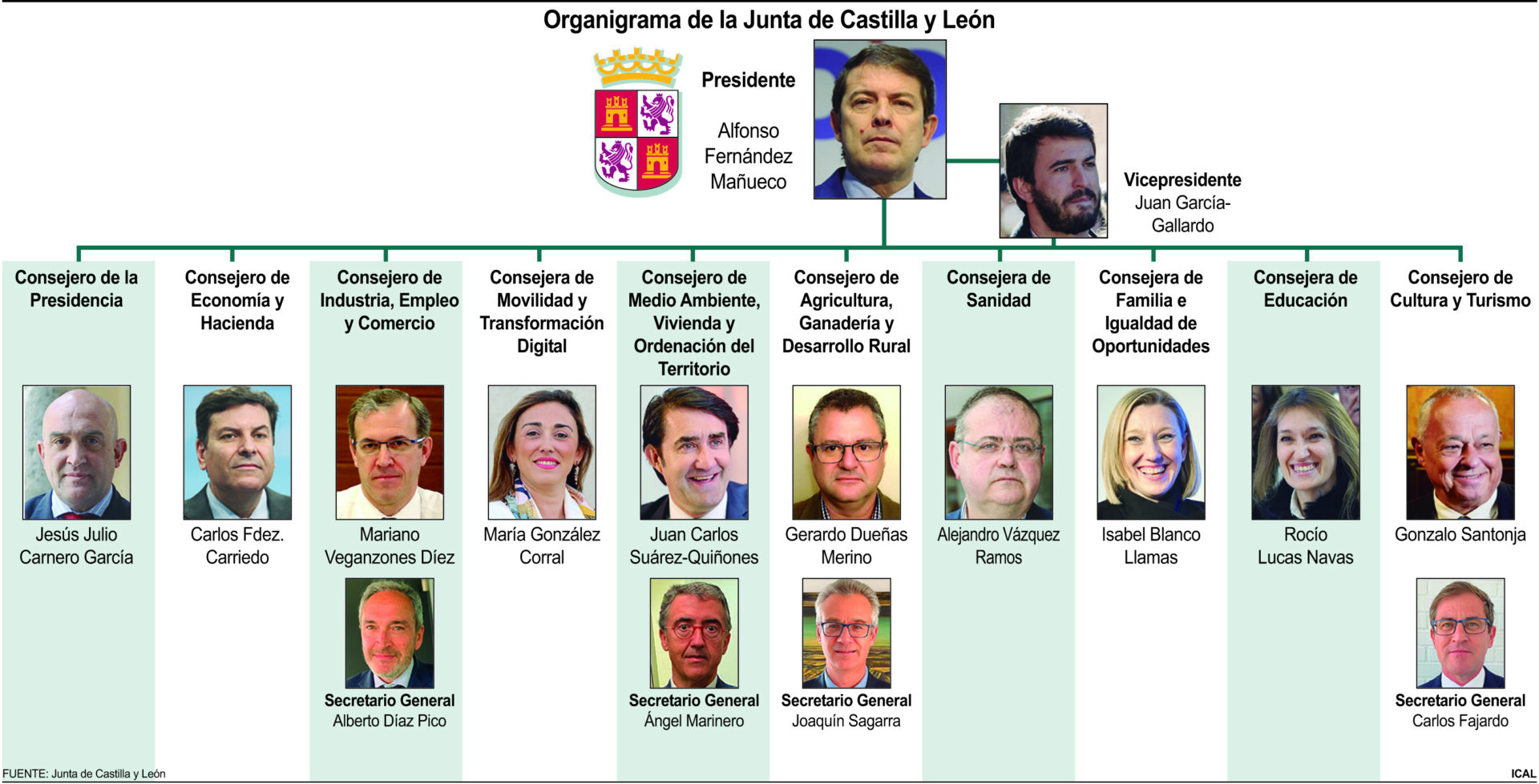 El Consejo de Gobierno de la Junta de Castilla y León aprobó hoy el nombramiento de cuatro secretarios generales del nuevo ejecutivo de PP y Vox que se incorporarán a las consejerías de Industria, Comercio y Empleo; Medio Ambiente, Vivienda y Ordenación del Territorio; Agricultura, Ganadería y Desarrollo Rural y Cultura, Turismo y Deporte.