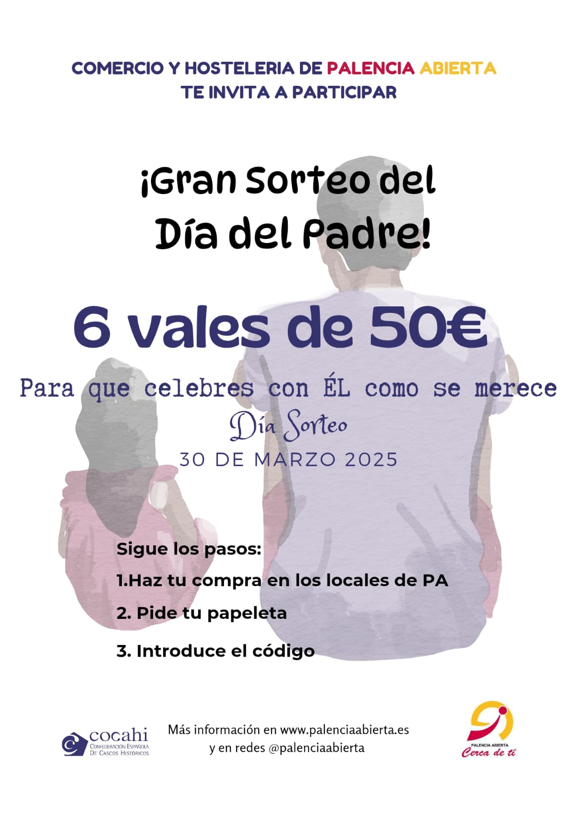 Con motivo de la celebración del Día del Padre, los establecimientos comerciales y hosteleros de Palencia Abierta han organizado un sorteo en el que se entregarán 6 vales de 50 euros cada uno de ellos para que los afortunados ganadores puedan disfrutar de una bonita celebración con sus seres queridos.