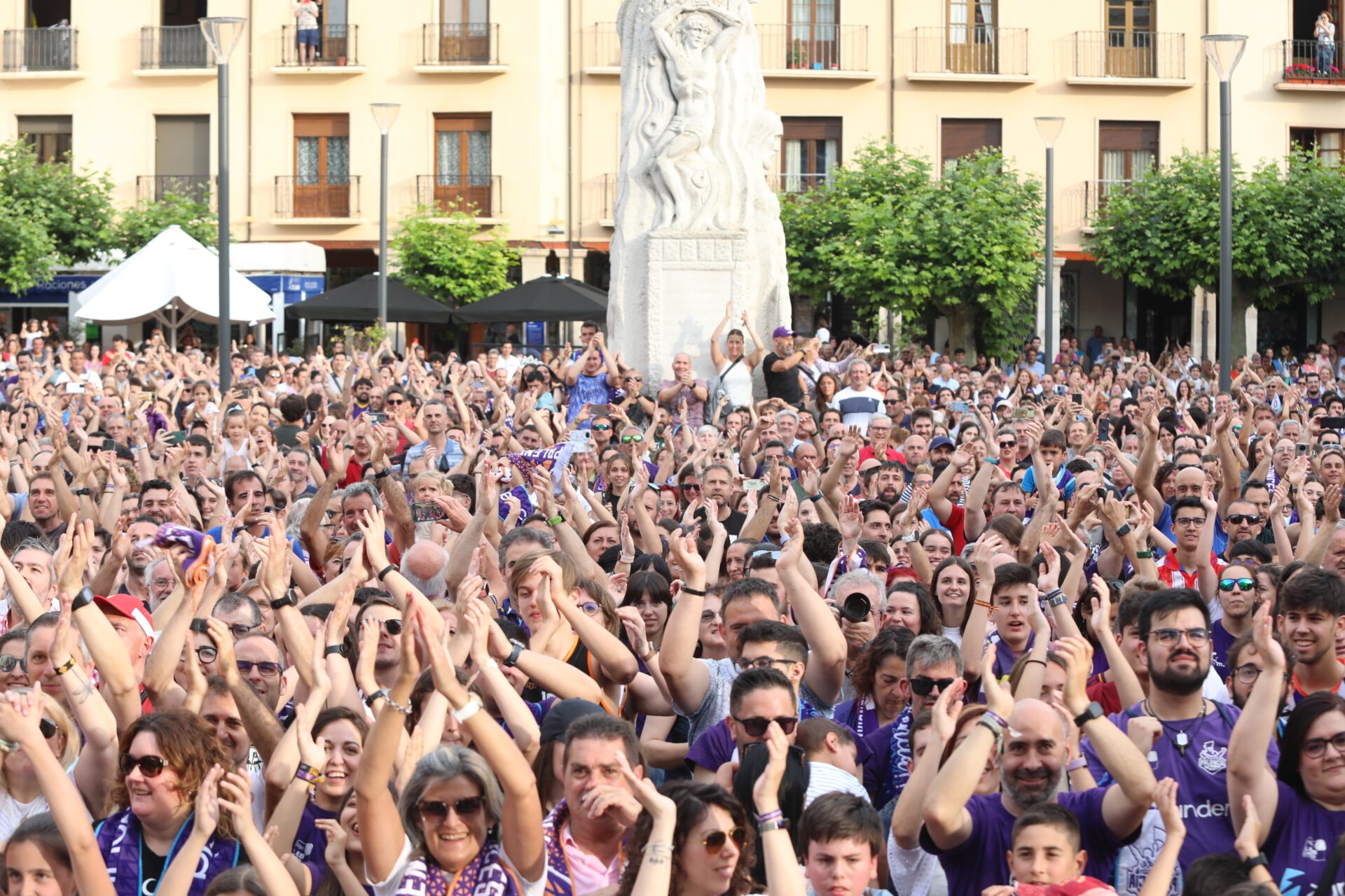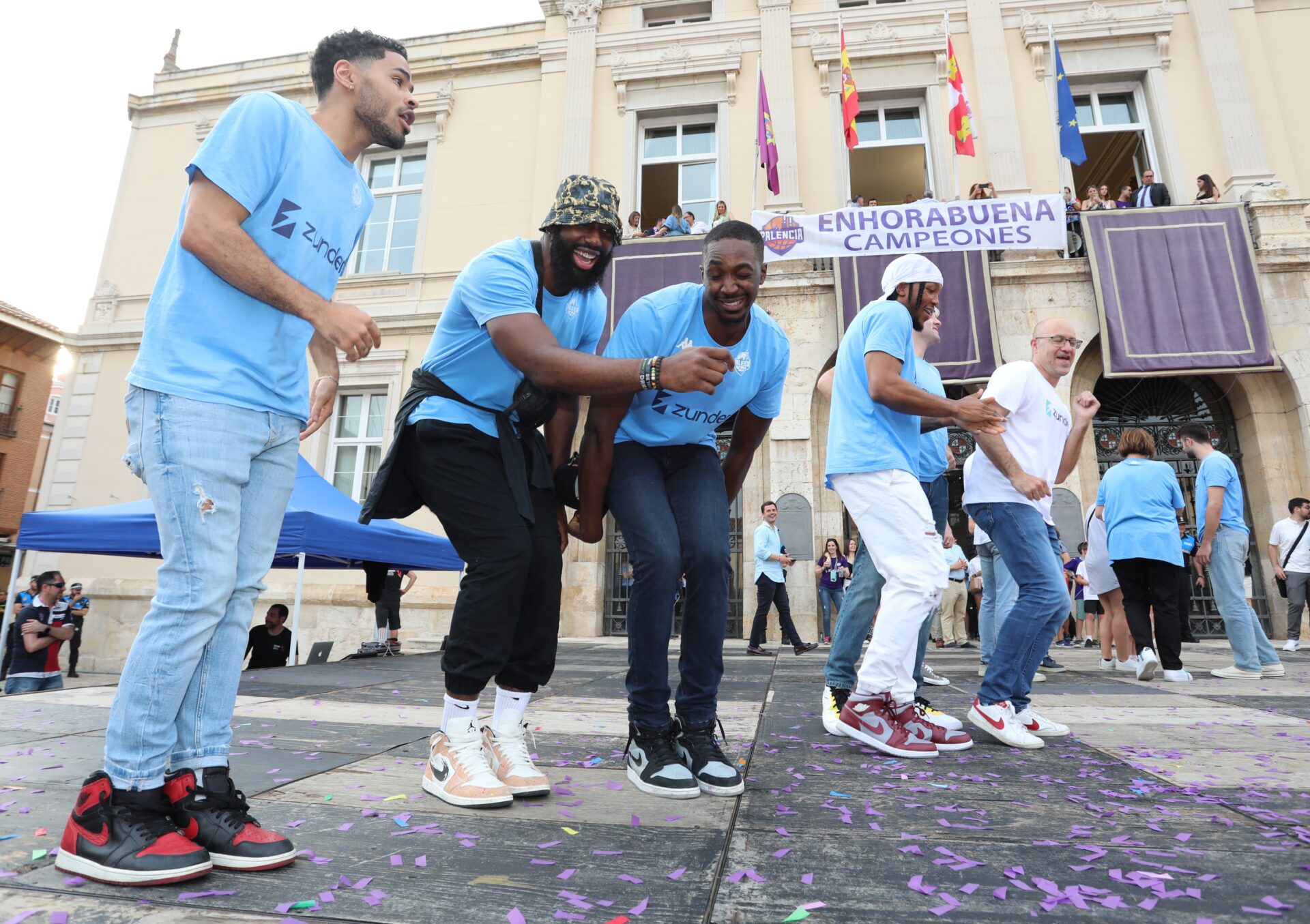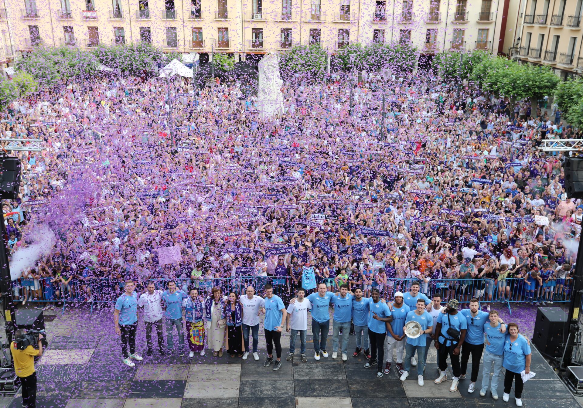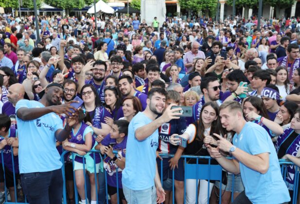 Posteriormente han saludado desde la balconada de la Casa Consistorial y han bajado junto a los aficionados a los que han ofrecido y con los que han festejado el ascenso a la máxima categoría nacional del baloncesto.
