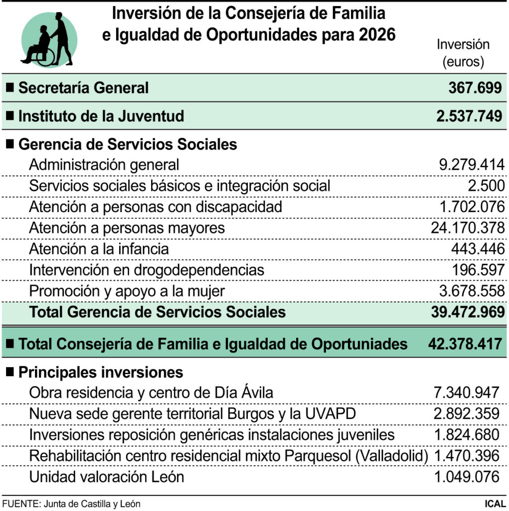 Las cuentas de Familia se completan, principalmente, con los 2,8 millones para la nueva sede de la Gerencia Territorial de Servicios Sociales de Burgos y la Unidad de valoración y atención a personas con discapacidad de Valladolid. También, habrá 511.809 euros para la construcción, equipamiento y reposición de edificios de Servicios Sociales.