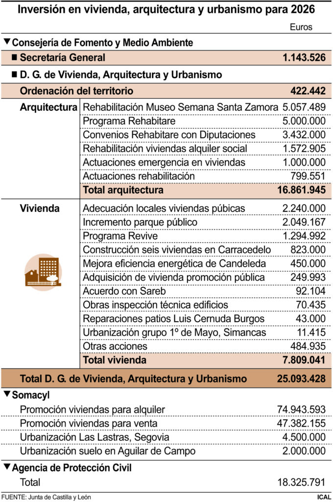 La Junta de Castilla y León prevé movilizar en 2026 unos 123 millones de euros en la promoción de viviendas públicas, con unos 75 millones para mejorar la oferta de alquiler y 48 para la venta a futuros propietarios. Además, se reservan 5,05 millones para la rehabilitación del Museo de Semana Santa de Zamora y 6,5 millones para la urbanización de suelo dedicado a vivienda en Aguilar de Campoo (Palencia) y Las Lastras, en Segovia.