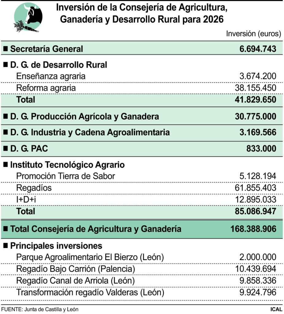 La Consejería que encabeza María González Corral divide las inversiones en regadíos a través de dos de sus departamentos. Por un lado, el Instituto Tecnológico Agrario (Itacyl), que contará en total con 85 millones de euros, de los que 61,8 van a regadíos, 12,9 a I+D+i y otros 5,1 millones para la promoción de la marca Tierra de Sabor. Y por otro, la Dirección General de Desarrollo rural, que dirige a los regadíos otros 23,4 millones, que totalizan los 85,2.