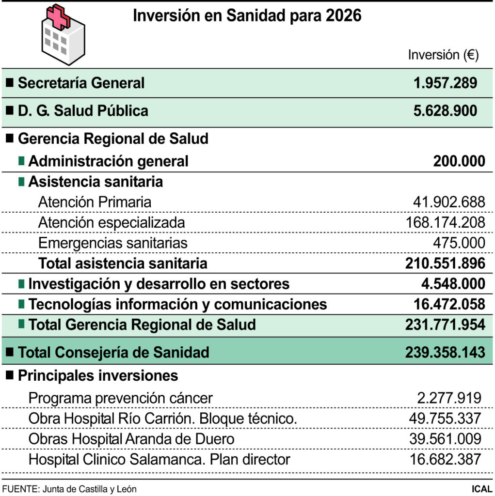 La ejecución del bloque técnico del Hospital Río Carrión de Palencia (49,7 millones) ahora paralizado, las obras del Hospital Santos Reyes de Aranda de Duero (39,5 millones) y el plan director del Hospital Clínico de Salamanca (16,68 millones) acapararán cerca de la mitad de las inversiones en Atención Especializada que la Consejería de Sanidad ejecutará el próximo año, según figura en el proyecto de de Presupuestos Generales de la Comunidad para 2026, registrado hoy en las Cortes de Castilla y León por el consejero de Economía y Hacienda, Carlos Fernández Carriedo.