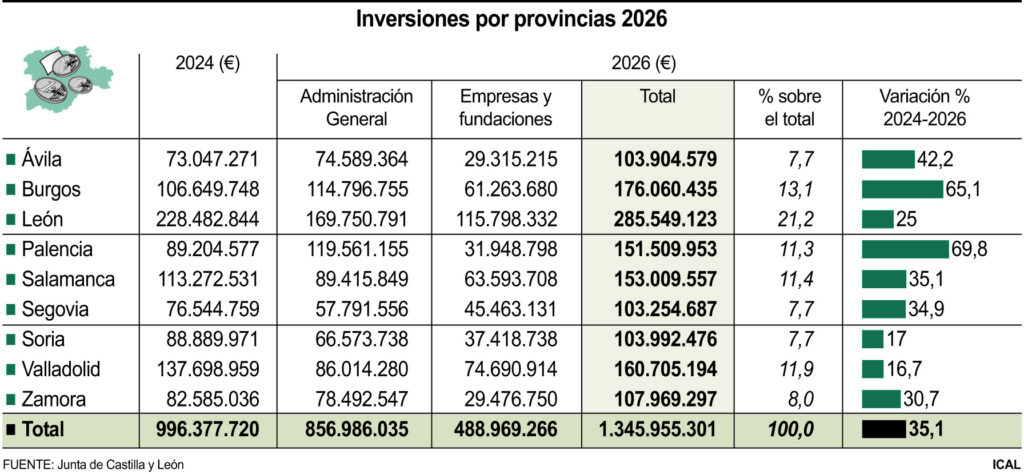 Lejos de León se sitúa ya la provincia de Burgos, la segunda por volumen de inversiones reales, con casi el 13,1 por ciento de las partidas repartidas en las cuentas, y más de 176 millones de euros. Las consejerías dirigen a Burgos 114,7 millones y las empresas y fundaciones 61,2, con una variación total de estos fondos respecto a 2024 del 65,1 por ciento.