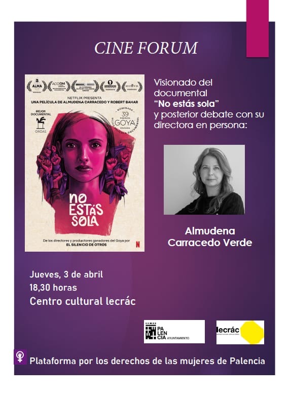 Mañana jueves 3 de abril de 2025 a las 18:30h se contará en Palencia con la presencia de Almudena Carracedo, directora junto con Robert Bahar, del documental No estás sola, que se proyectará en el Centro Cultural Lecrác.