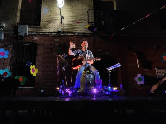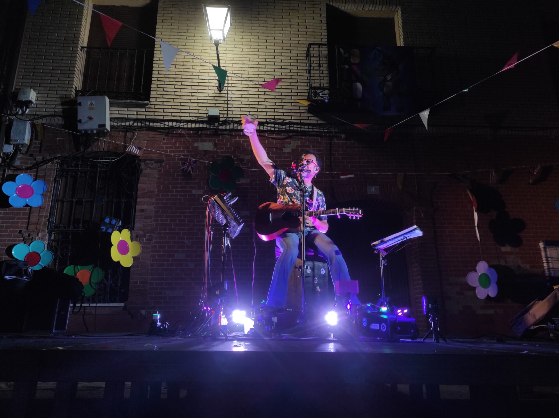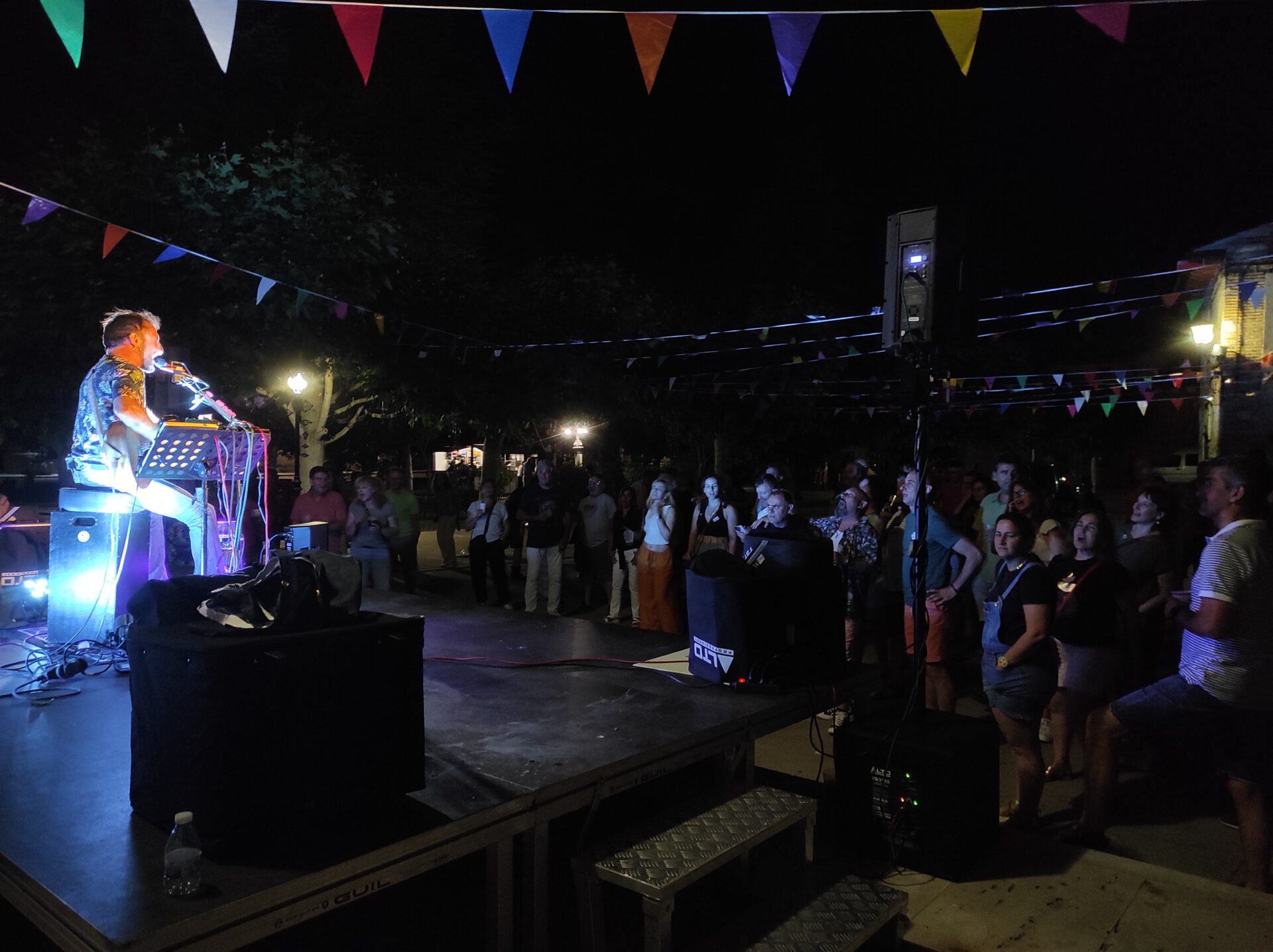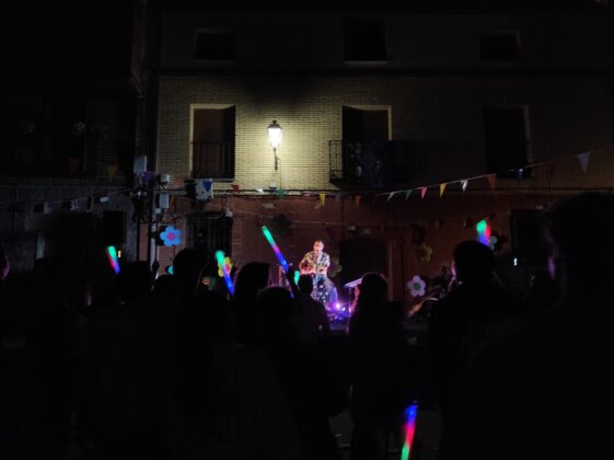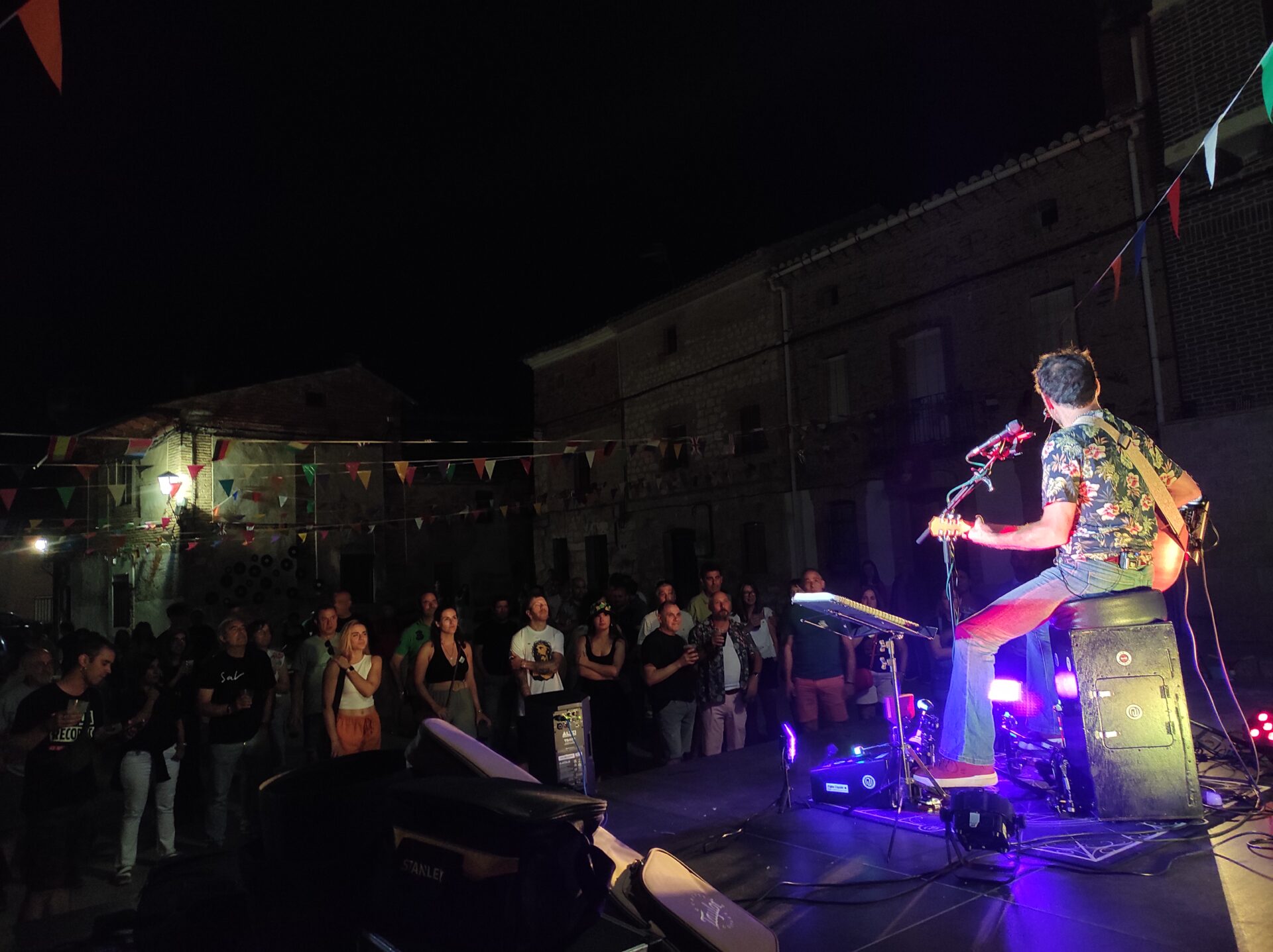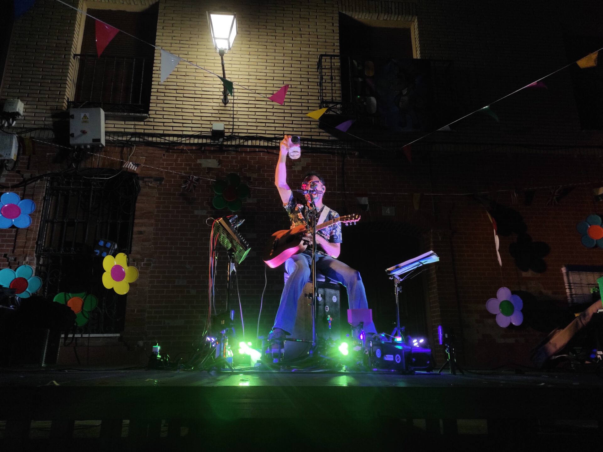 Pablo Líquido, que viene desde Pamplona, dice que sus compañeros de El Cruce han acabado muy arriba y que él empieza muy abajo. Admite que no suele tocar en festivales porque 1h tarda en calentar. Es un concierto sorprendente, pues donde suele verse a un grupo nos encontramos con un hombre sentado, con dos pedales para la percusión, una guitarra, un micrófono y una mesa de sonido montada al alcance de la mano. Todo lo hace él, según cuenta durante el concierto, sus videoclips incluidos. Después de haber visto el concierto, tengo que admitir que no me extraña, pues no hace falta nada más, la música suena genial y el carisma de Pablo sobra para atrapar al público. Reconoce, apenado, que se ha portado bien antes del concierto y se encuentra en un elevado estado de sobriedad, vocaliza y se acuerda de las notas, “lamentable”, apunta. Está claramente determinado a solventar la situación, brindando entre cada canción con el pueblo. Si hay alguna pausa en la que parece que tarda en tomarse un trago el público, que se ríe con cada brindis como si fuera el primero, se lo recuerda. No piensen nuestros lectores que está haciendo apología del alcoholismo, pues tiene una explicación (lo suficientemente escatologica para que me ahorre reflejarla) de por qué hay que beberse los cubatas antes de que se disuelva por completo el hielo. Va alternando versiones en inglés y castellano, e incluso se arranca en senegales en un tema. Al ver el espacio que deja el público frente al escenario comenta que 25 años que lleva de carrera, no ha conseguido salir en los periódicos y que no hace falta reservar ese espacio a la prensa. Cuando la organización reparte tubos de luz, dice que le va a dar un ataque de algo con las lucecicas, pero aún así continúa sin perder fuelle. Entre el público se oyen comentarios alabando la calidad musical del artista, que recuerda que no sería nada sin el público. Cuando termina el concierto pasadas ya las 3h del espectáculo, la gente corea “Otra, otra..” Pablo bromea “¿No tenéis casa o qué?” pero se vuelve a sentar y toca hasta las 2am, regalándonos casi media hora más de concierto en el que toca temas que no tiene en el repertorio, pero suenan tan bien como los que sí están incluidos. En repetidas ocasiones durante el concierto agradece la confianza a la organización, lee su nota en la que menciona a la alcaldesa, a la ADC El Cerrillo, a Cristina y a Juan Cruz y en especial al Curro, quien asegura ha insistido en que viniera. Se despide pidiendo al público que se porten mal, pero no sean malos.