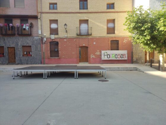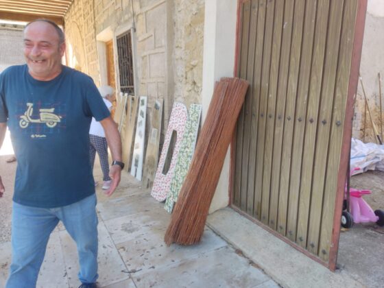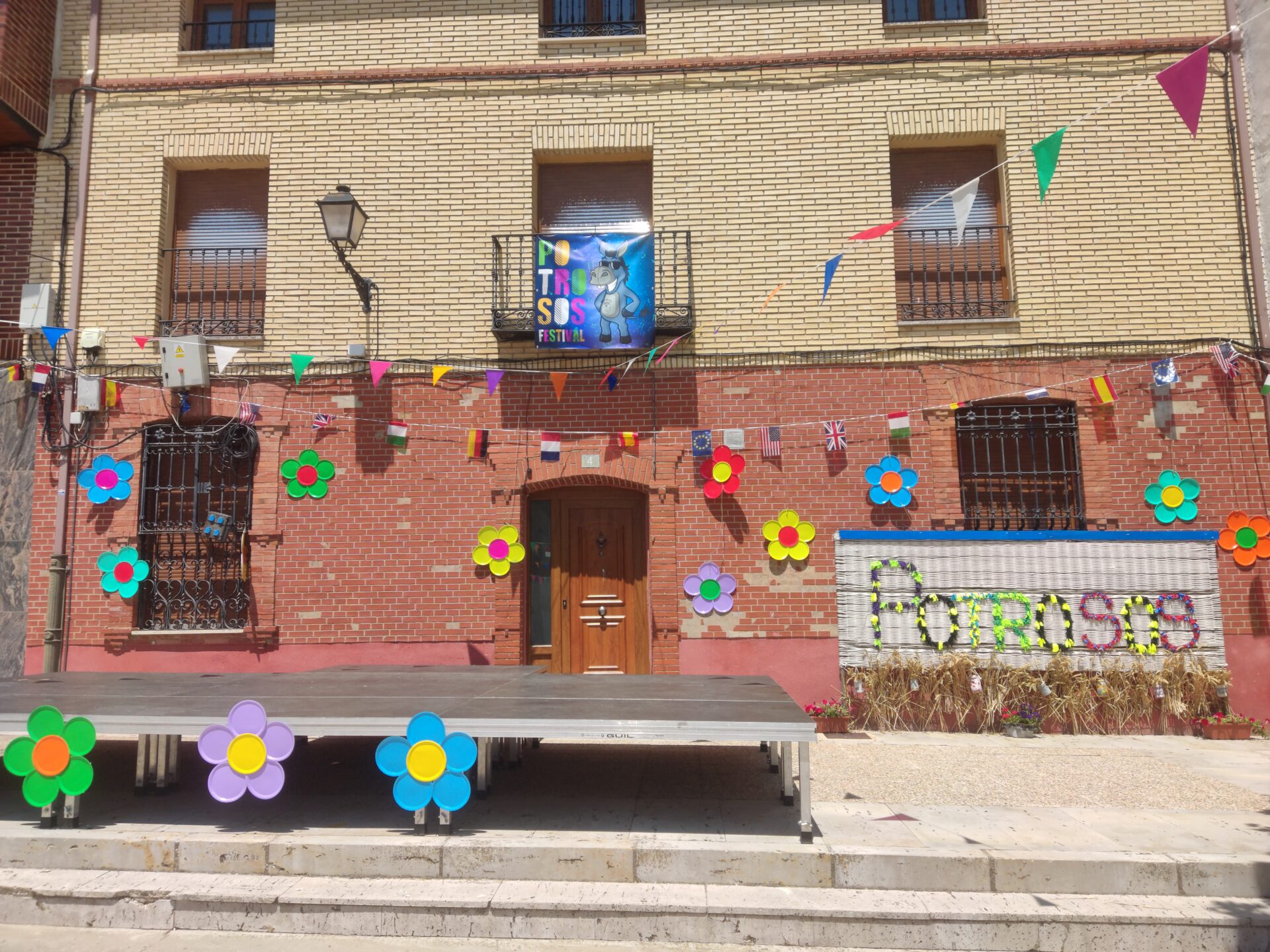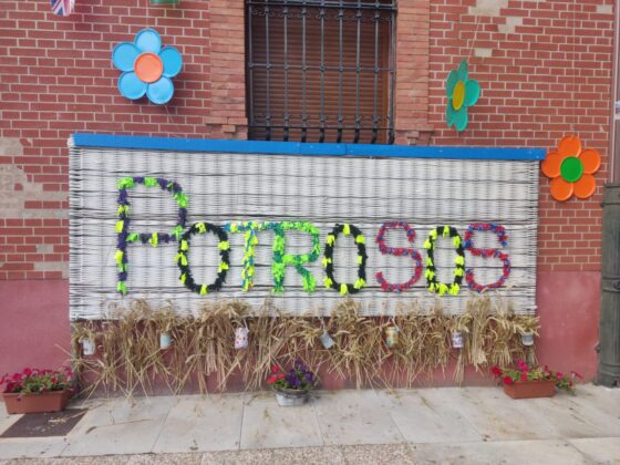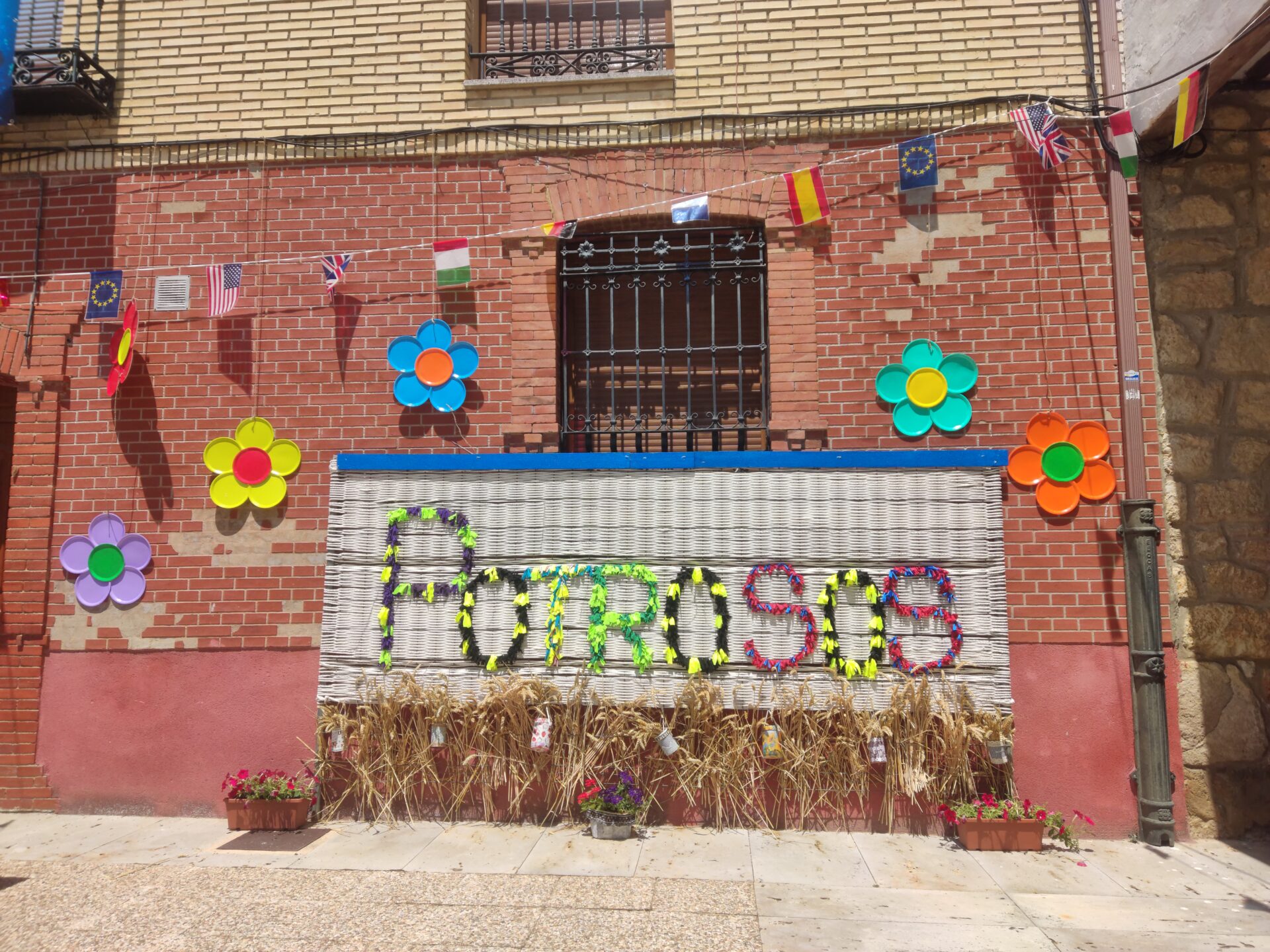 El programa del festival Potrosos ’25, abre con una cita en la plaza para colocar las decoraciones. Pero el festival Potrosos no comienza ahí. Hay personas que llevan meses trabajando en las decoraciones, algunas se han reunido en el antiguo Teleclub, ahora sede de la Asociación Deportiva y Cultural El Cerrillo. Allí se han realizado numerosas manualidades, por parte de los miembros de la asociación. Así las ideas de Cristina han ido tomando forma, gracias a ella y a toda la gente que se arremanga y trabaja para que todos podamos disfrutar de la fiesta. Pero no ha sido el único lugar desde el que se ha construido este festival. Juan Cruz, ha pasado 3 meses trabajando en su taller, cortando las letras de madera que han servido como epicentro de las decoraciones y restaurando pupitres de varias épocas en las que existía escuela en el pueblo.